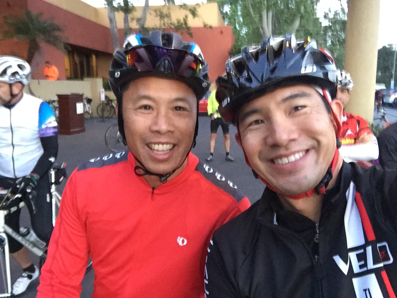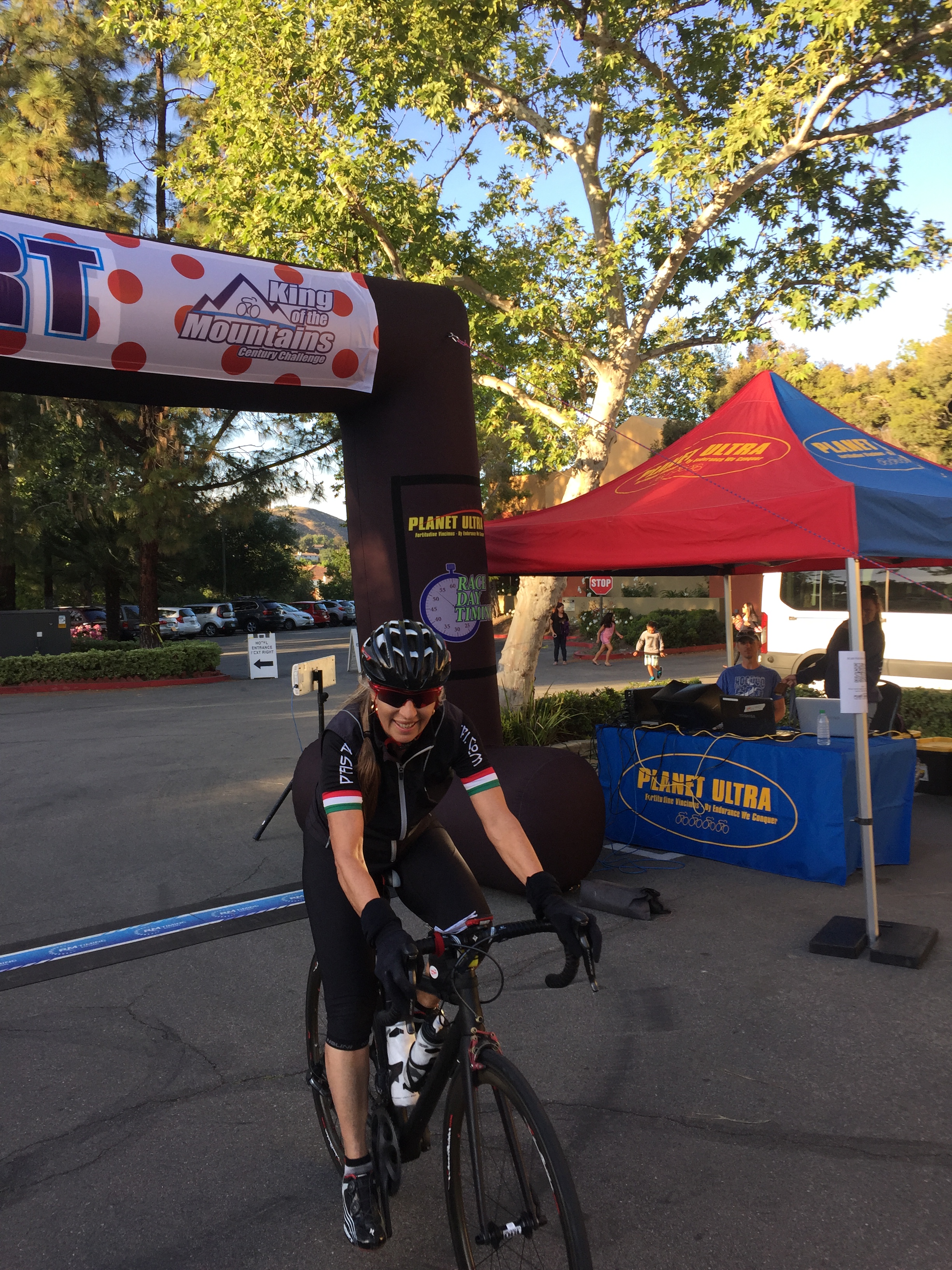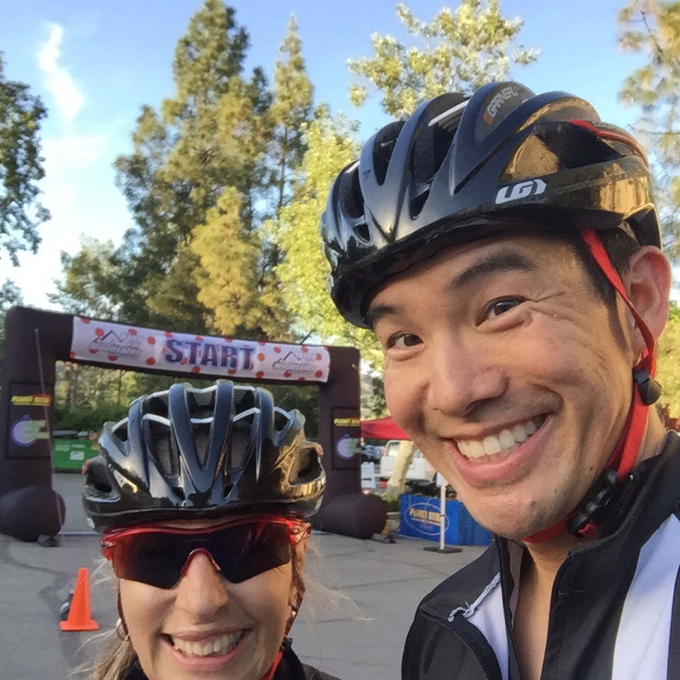 Pre-race. Lynda and I drove up Friday afternoon to the host hotel Sheraton Agoura Hills. We shopped a little at the bike shop and running shop. I splurged and got two primo running shorts. One is a North Face with compression shorts inside and nifty pockets slots for goos. We had dinner at an groovy Italian spot. Guiardino’s. Obscure location in the middle of a office park, but the filet mignon melted in my mouth. Yum! The server was this young Italian guy with super thick Italian accent, possibly completely fake. The Yelp had about 20 pictures of the chocolate melting cake. Had to get it. Yum again. Then, we picked up breakfast and race essentials at Sprouts. Huge oranges. The we unpacked and prepped our bikes and checked in at packet pickup.