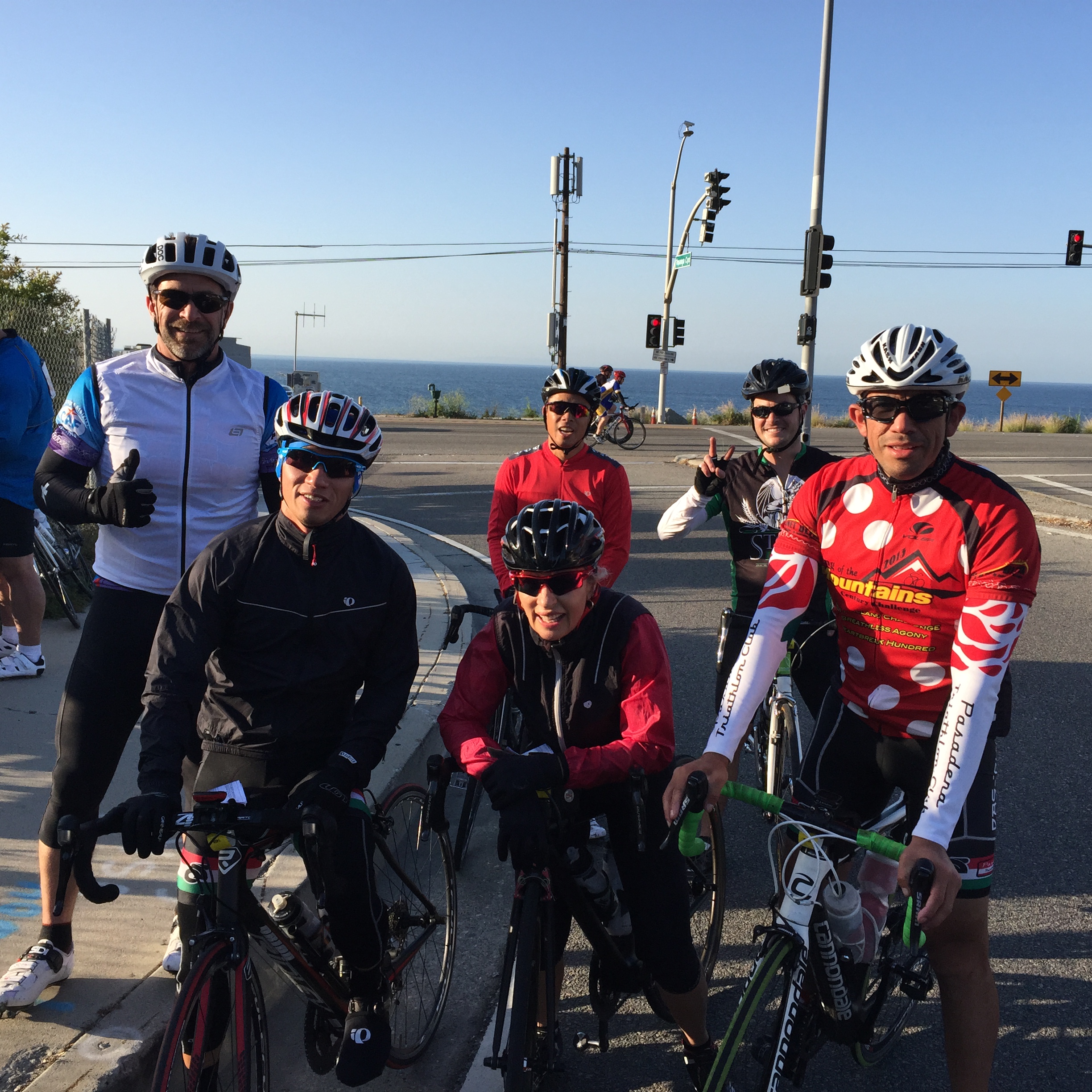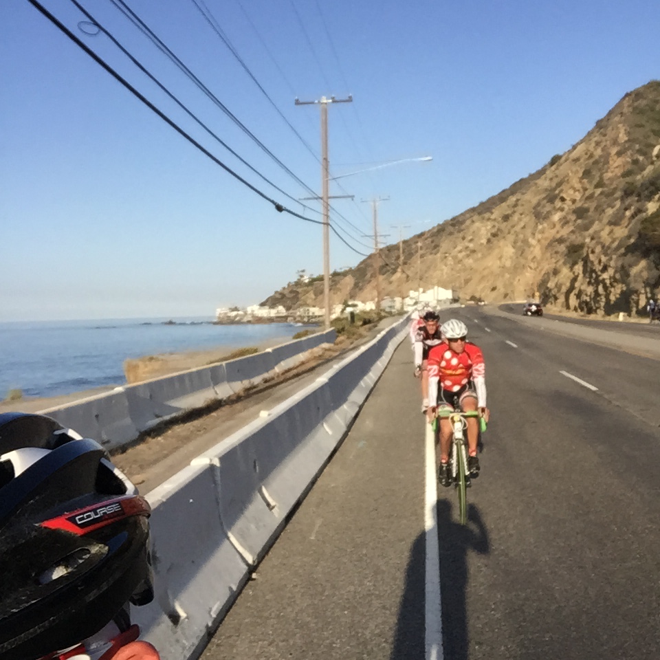 Along the wilderness section on Cornell, Steve saw bobcats and coyotes, who watches silently as a huge pack of bikers rolled through their neighborhood. First climb was through Malibu Canyon and down to Pacific Coast Highway (PCH). This was the most traffic, so 7am was the best time to do. The tunnel was actually very well lit, due to some construction. Sometimes that tunnel is a scary black hole. Rolling along PCH is amazing. The mansions and restaurants along the coast are beautiful. The water was sparkling in the morning sun.
