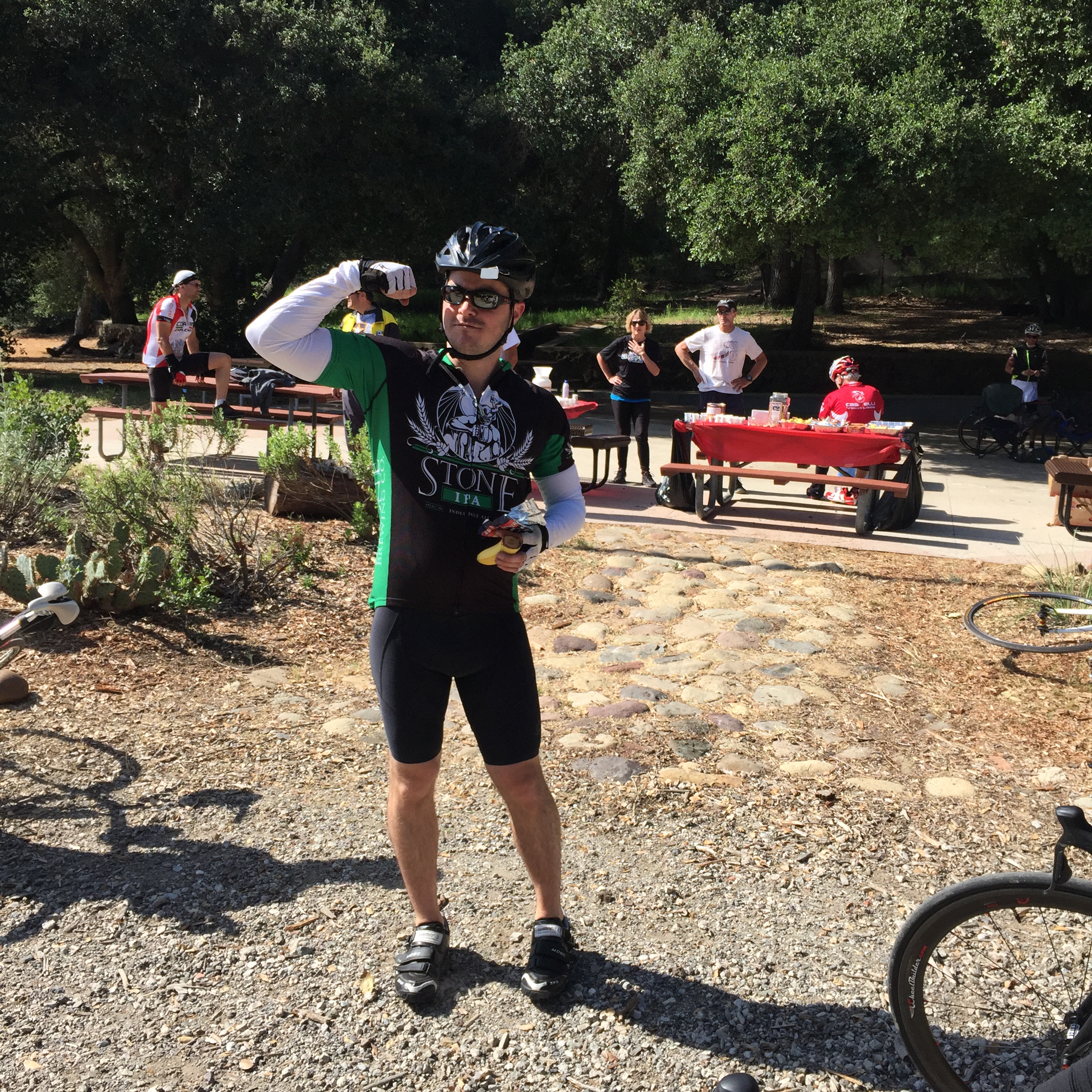 Gregg started later than us, and caught up to us here. After Ryan fixed his flat, he felt invincible. My rice cakes and nutrition planned worked well all day long. No tummy aches nor GI adversities. I ate bananas at each rest stop and filled my bottles with water and Perpetuem (hammer power).