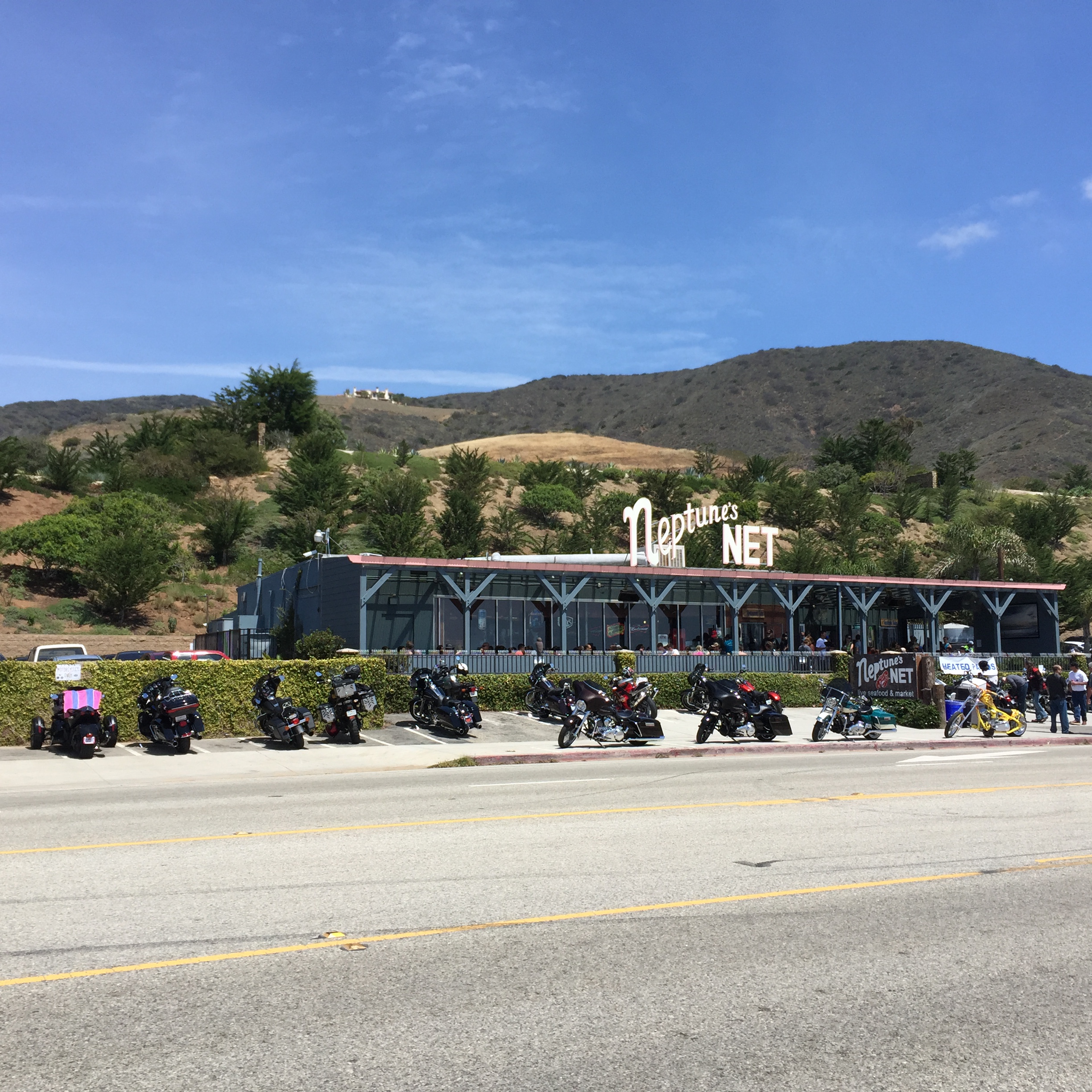 Neptune Net is a restaurant on PCH and Yerba Buena, we turned up there earlier in the day and passed it along PCH. A great day for a beach trip. Surfers were out all along the coast.