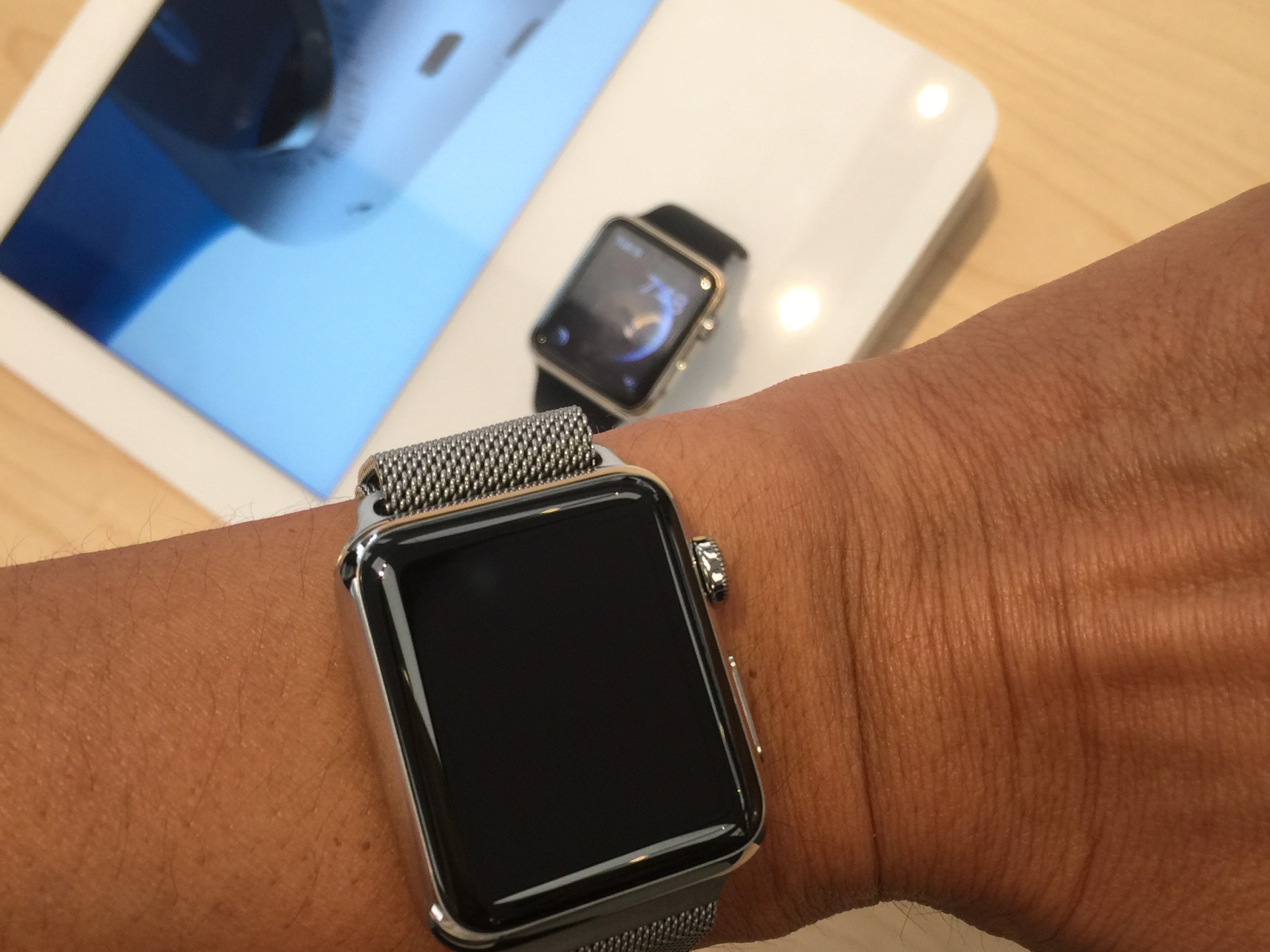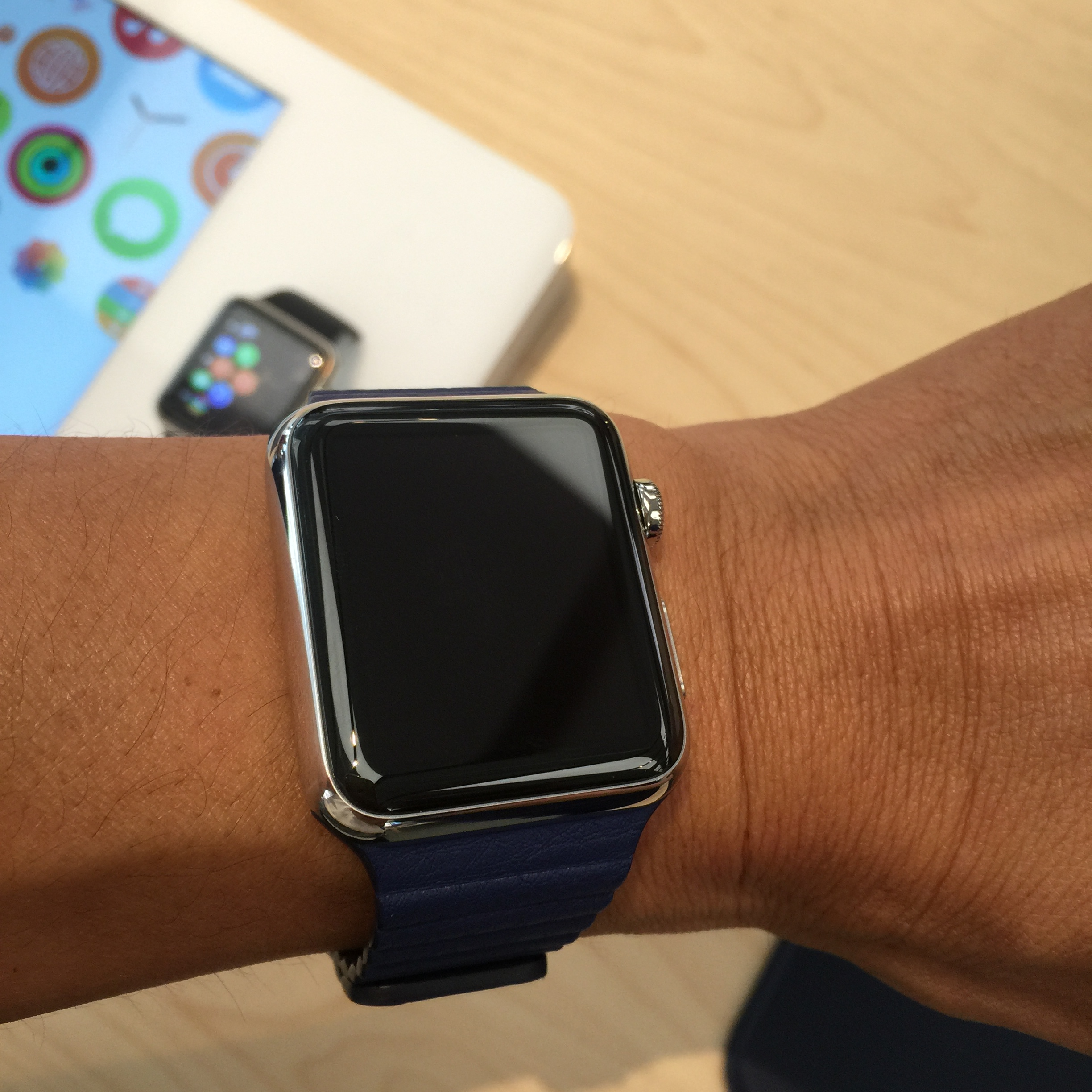 So, I dragged my daughter to the Pasadena Apple Store. I was expecting a wait. But, I got to try on the watches right away. I have to say, it felt great on. I could wear the bigger one ()42mm screen) and still fit on my thin wrist. I brought my clunky Garmin 910XT along, just for comparison. I don’t wear a watch on a daily basis, but that may change.