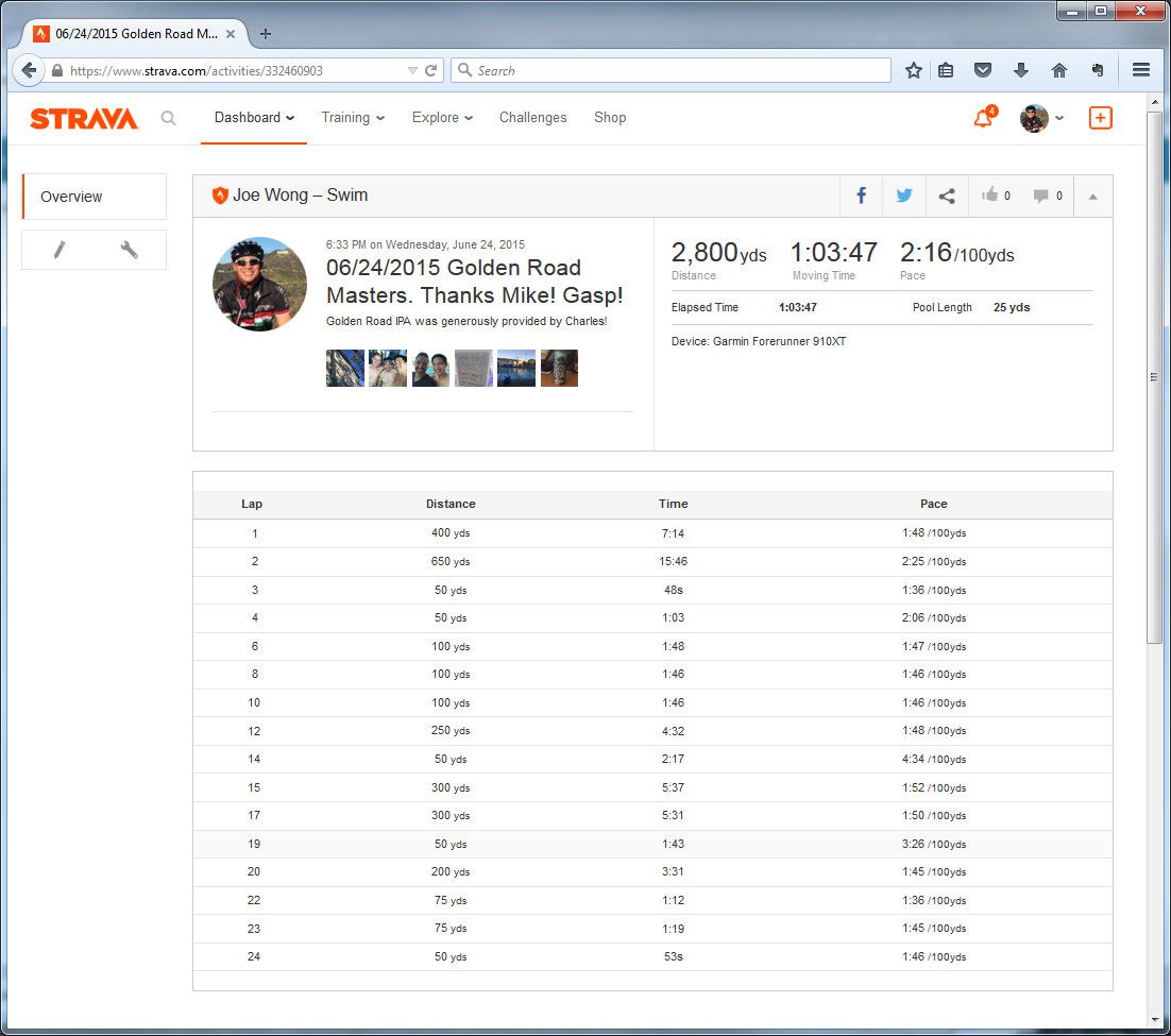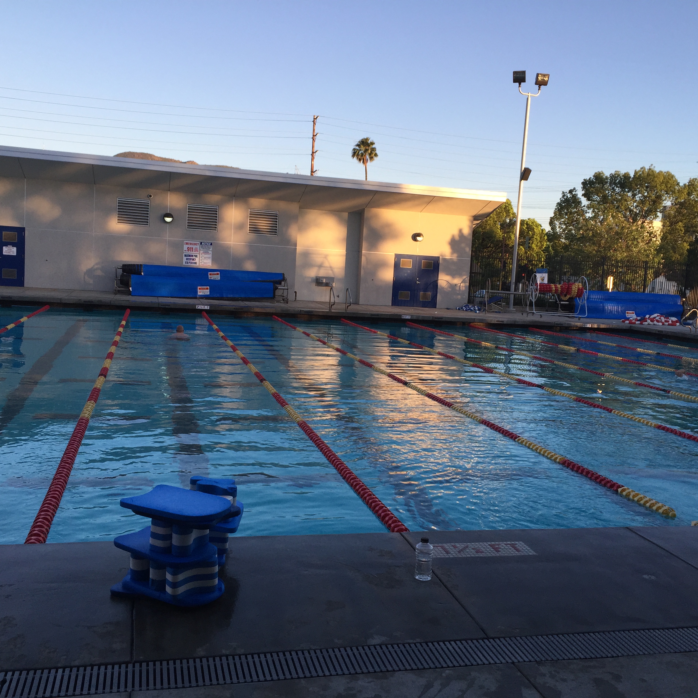 I swam masters class with Mike at Golden Road Aquatics in Burbank, at the Verdugo Pool. I saw my friends from Pasadena Tri Club, Bryan and Luis. I don’t do master classes, so It was a hard workout. Great, but hard. My Garmin 910xt is really wonky now. There are 6 lanes for masters. I was in the 4th lane (middle speed), with Bryan and another guy Brad from South Bay. I usually never kick and there was definitely kicking in this workout. Mike was working my hard. I have lots of room for improvement. My right arm crosses over. My left arm is too straight. My head is underwater too far. I’m trying to process all this, while Bryan is lapping me! On jump out of the pool, my calf cramped. Slightly embarrassing, but thankfully it subsided quickly. I’m sure it’s because I never kick when I swim, and my calves were like, wtf? The rest of the Verdugo facilities are fine. Although the lockers are tiny slots, the showers, and bathrooms are clean, well lit and tidy. Some of the showers are seriously LOW flow, the center ones are better. Overall, it was really fun to swim with friends on a warm Wednesday afternoon. Thanks, Mike!