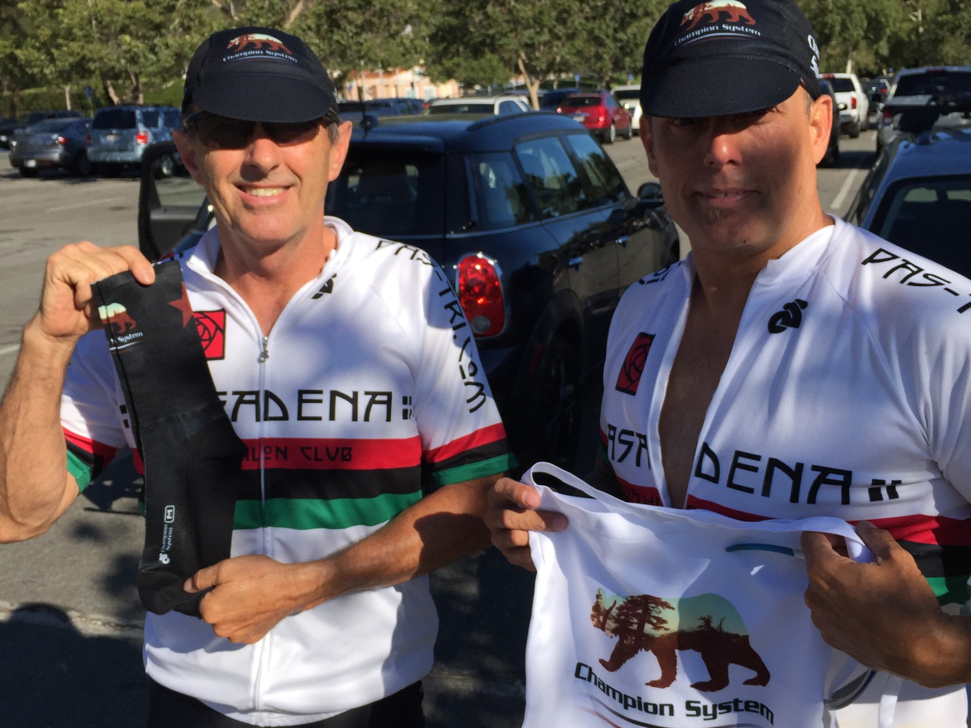 Brian from Champion Systems gave us Tour of California Caps, Socks, and Feedbags. There is a brown bear on there. Good turn out tonight. It was a hot day 95°F, but it started to cool off as we started off.