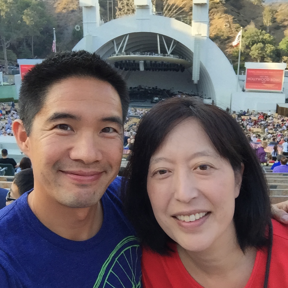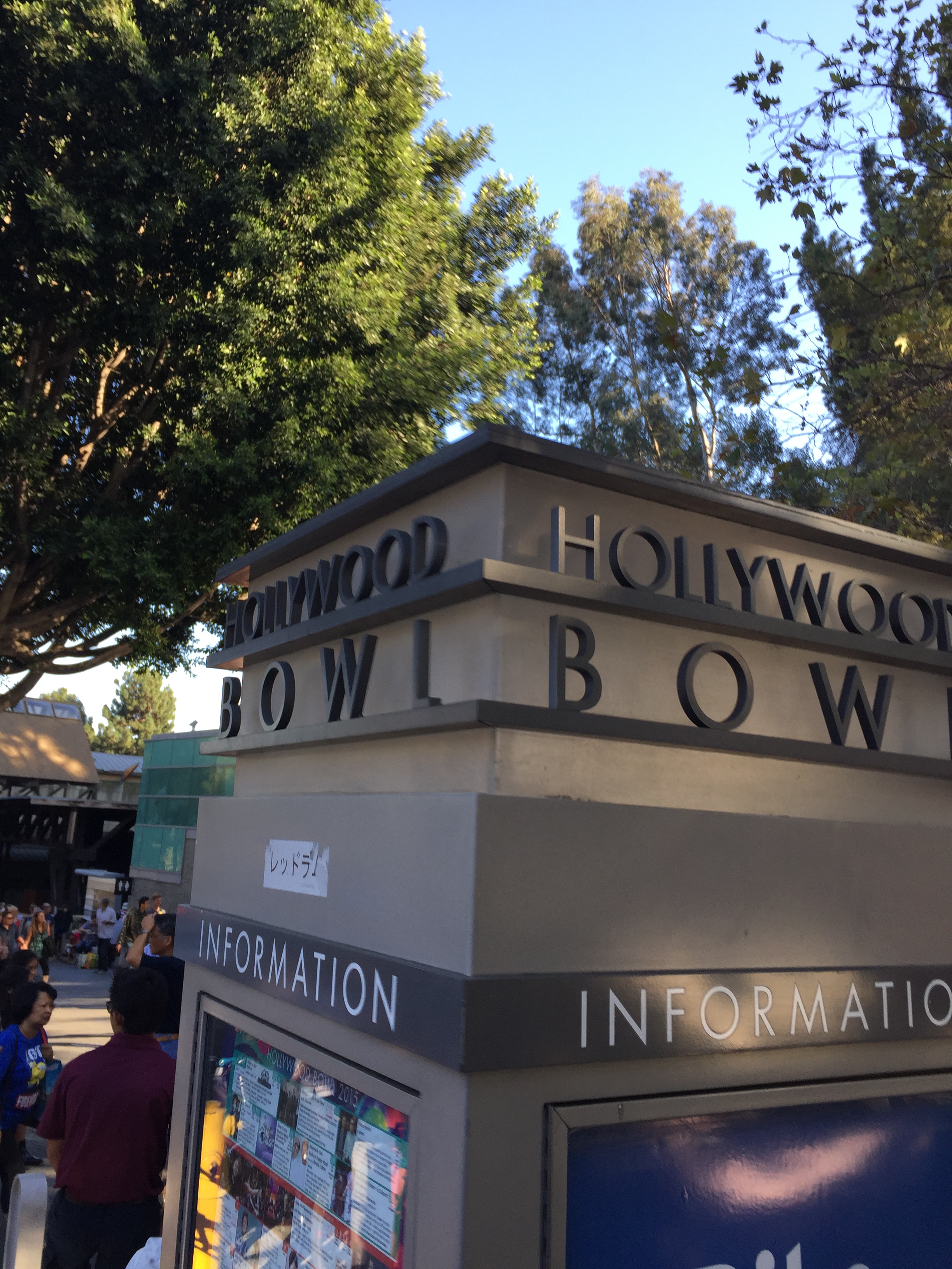 We hung up our big flag at home. Then, we take a shuttle bus from Pasadena. It’s a lot better than trying to park at the Bowl. It zips you out right after the concert is over.