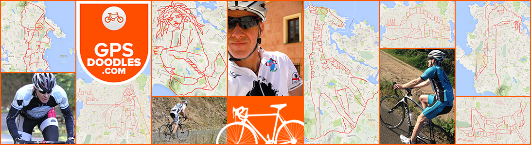 Since I started pedalling my art on the streets of Victoria on the first day of 2015, I’ve amassed a portfolio of 50 GPS doodles – 34 pictures, 11 bike-writing messages and five creations that comprise a combination of both. Click on the poster below to see 31 of my favourites…plus the one that started it all!