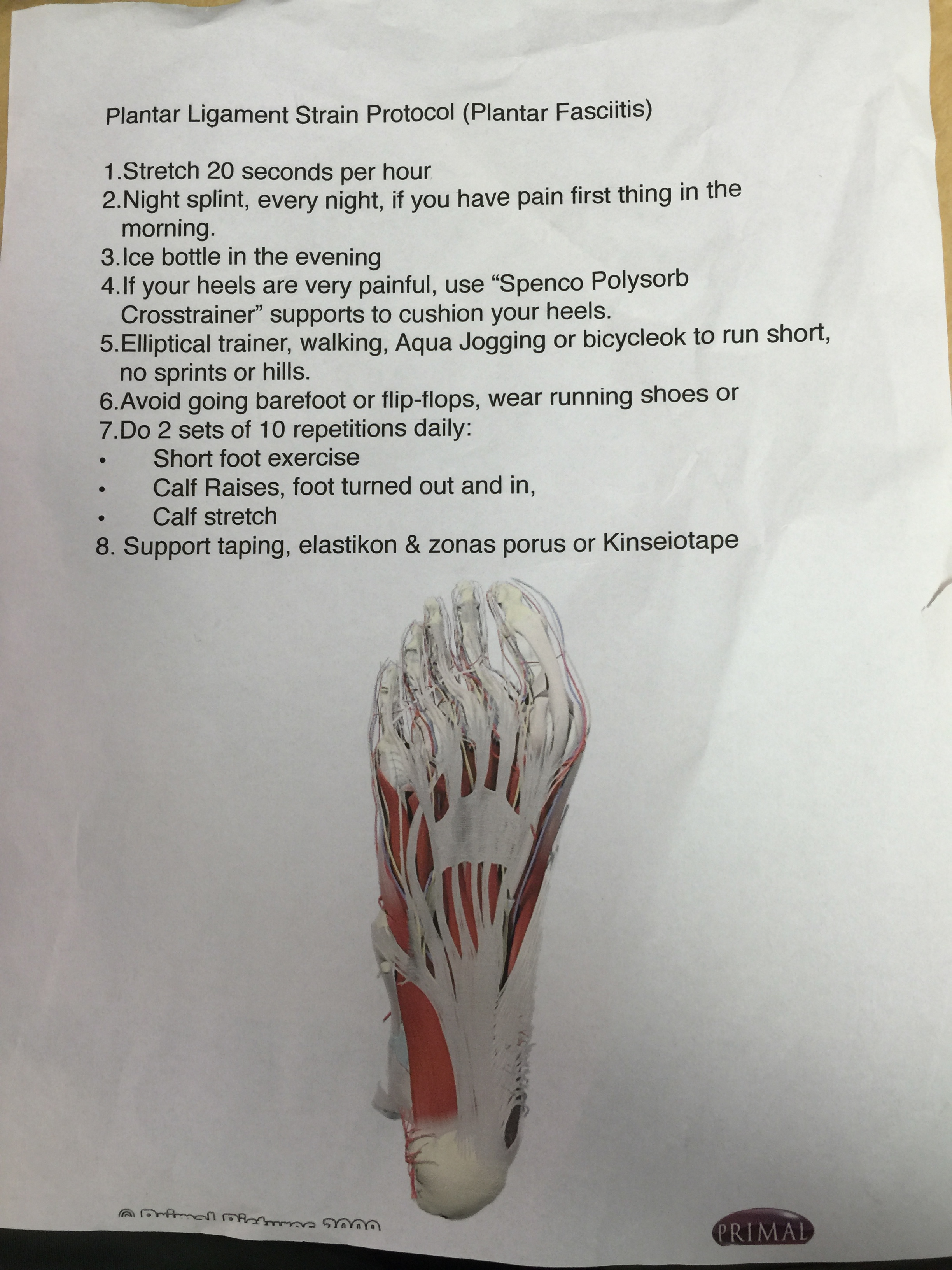 I went to the Chiropractor Steve Smith. He’s a marathoner and founder of the Pasadena Pacers. As soon as I pointed to where it hurt, he diagnosed it as Plantar Fasciitis. He used a flat shell and rubbed it along my inside arch and it was gnarly like sliding along a ruffled grate. Then he did the same motion on my other right foot and it was smooth. I thought he was kidding. He prescribed therapy shown below. He said it’s a moderate case. Okay to walk, and bike. Okay to run for short distances. No sprints, no hills. He also had the girl do electro-stim on the inside of the my arch. She showed me how to do the stretches and exercises. She also taped up my foot (see #8).