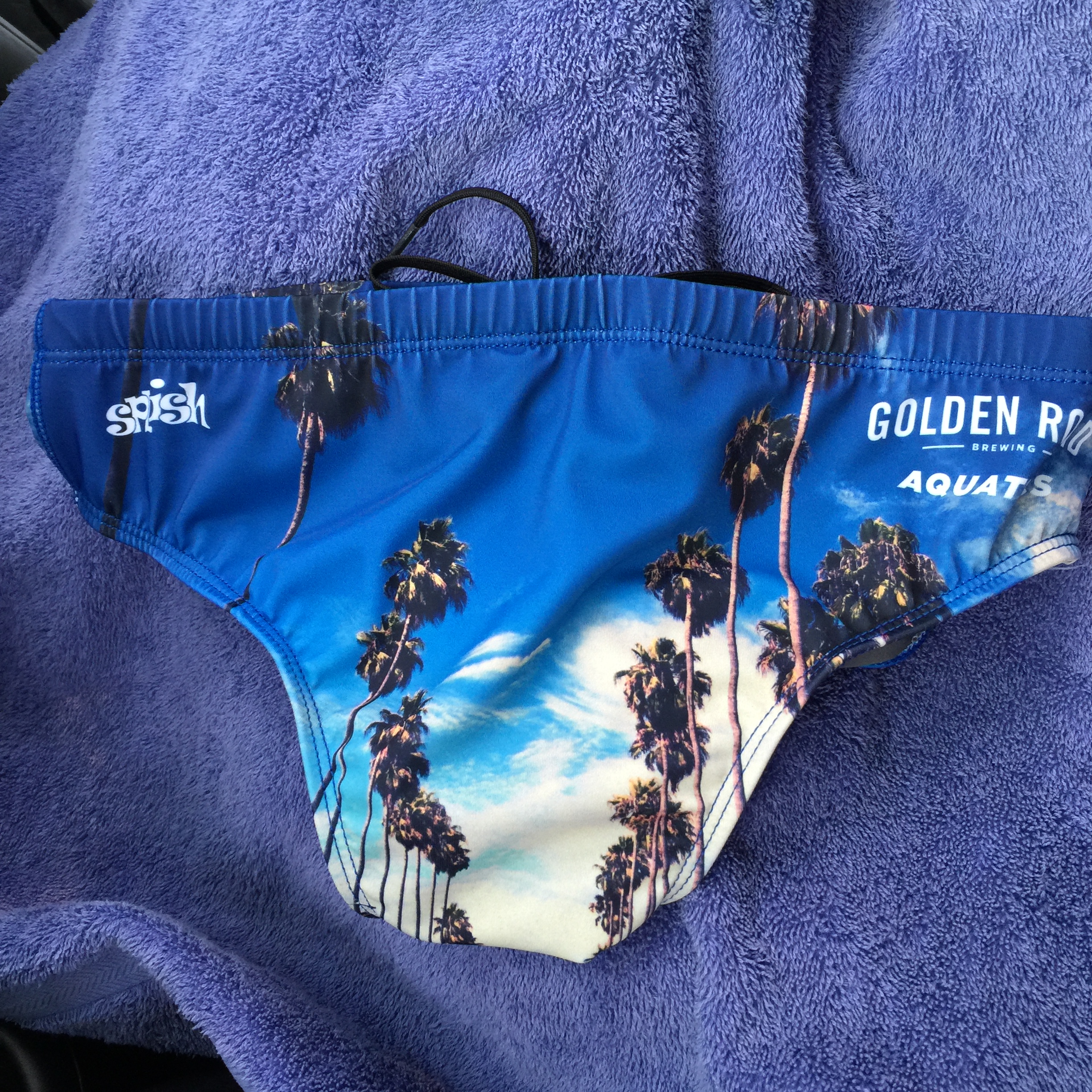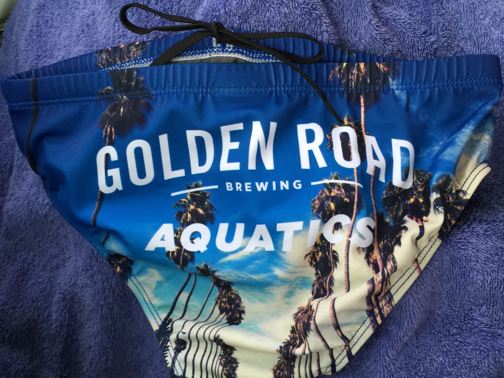 You know how you join a new team or get a new hobby, you can’t wait to get a team t-shirt. Well, I got my Golden Road Swim Speedo and Jammer. There’s Golden Road written right across the butt. Although I’m a little shy for a selfie in these, here’s what they look like. Cool LA palm trees.