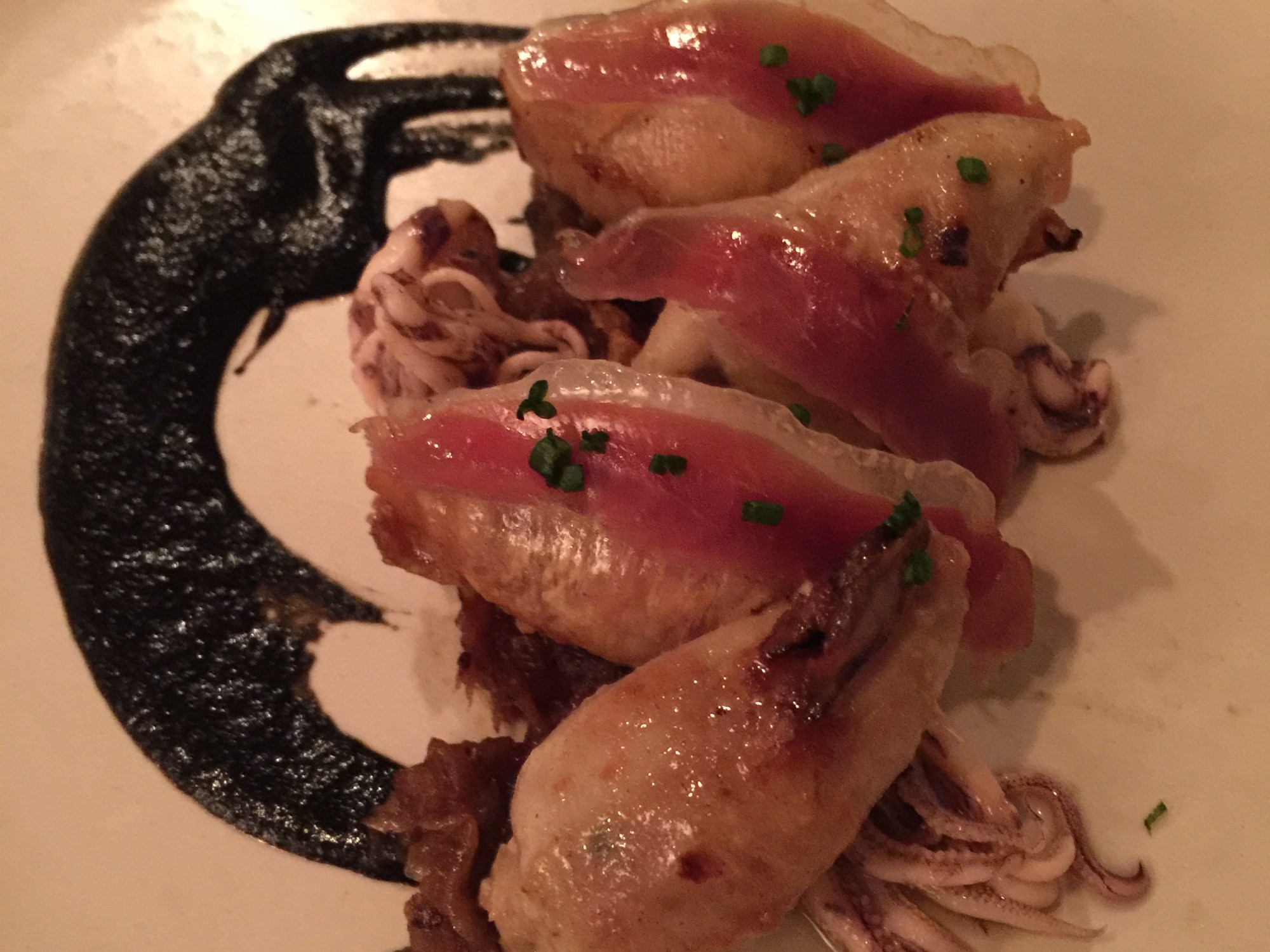 - Duck sausage-stuffed squid, salsa tinta, duck jamon. This was wild. Yummy. The squid was basically the casing for a duck sausage. This one was one of kind too. Texture and flavor were unique and terrific.