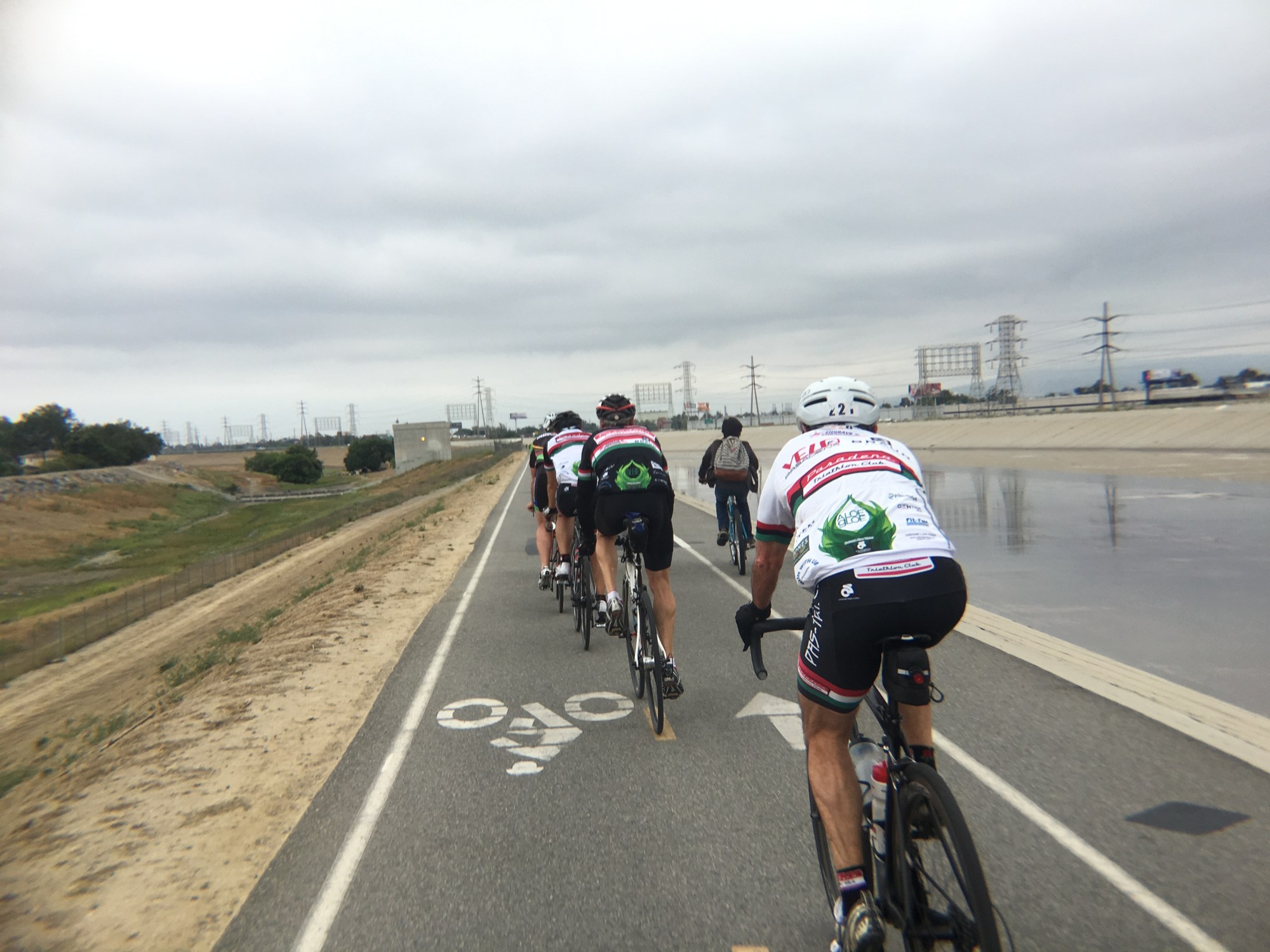 The Club left from Sierra Madre, but I met them at the Arcadia Golf Club. (I was running late, cuz I forgot my helmet at home.) On a cloudy day, we rode down the Upper Rio Hondo River Trail to Whittier. We crossed over to the Lower Rio Hondo River Trail, which merges into the Los Angeles River Trail in Lynwood. We had a stiff head winds in the southbound direction. I rode with Mike, Trevor, Philip, Paul, Rob, Gregg, Kirk.
