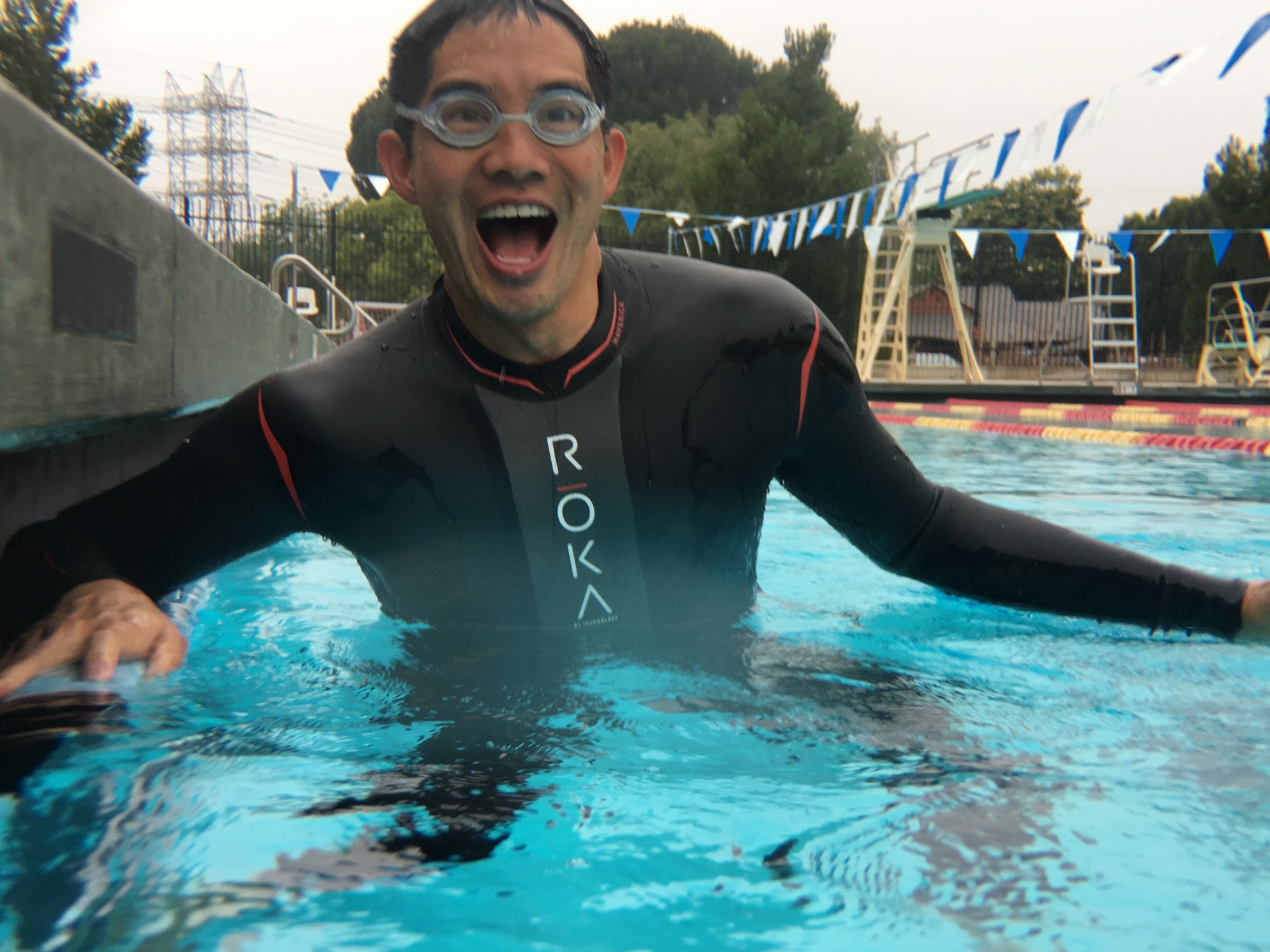 Putting on a wetsuit when you’re already wet is very difficult. My lane buddy Matt told me a trick to get it one. Stuff your feet through and pull the legs up a little bit. It get stuck your skin right away. He said to fill up with water under the shower or dip into the pool and fill the suit with water and stand up. When the water is filling up the suit, the suit releases traction from your skin. Then, as as gravity pulls the the water down and out your ankles, pull the suit up and it’s on like a charm. This trick also works on your arms. Stuff your arms in and then fill the arms with water. As gravity pulls the water down your wrists, pull the suit up your arms!
