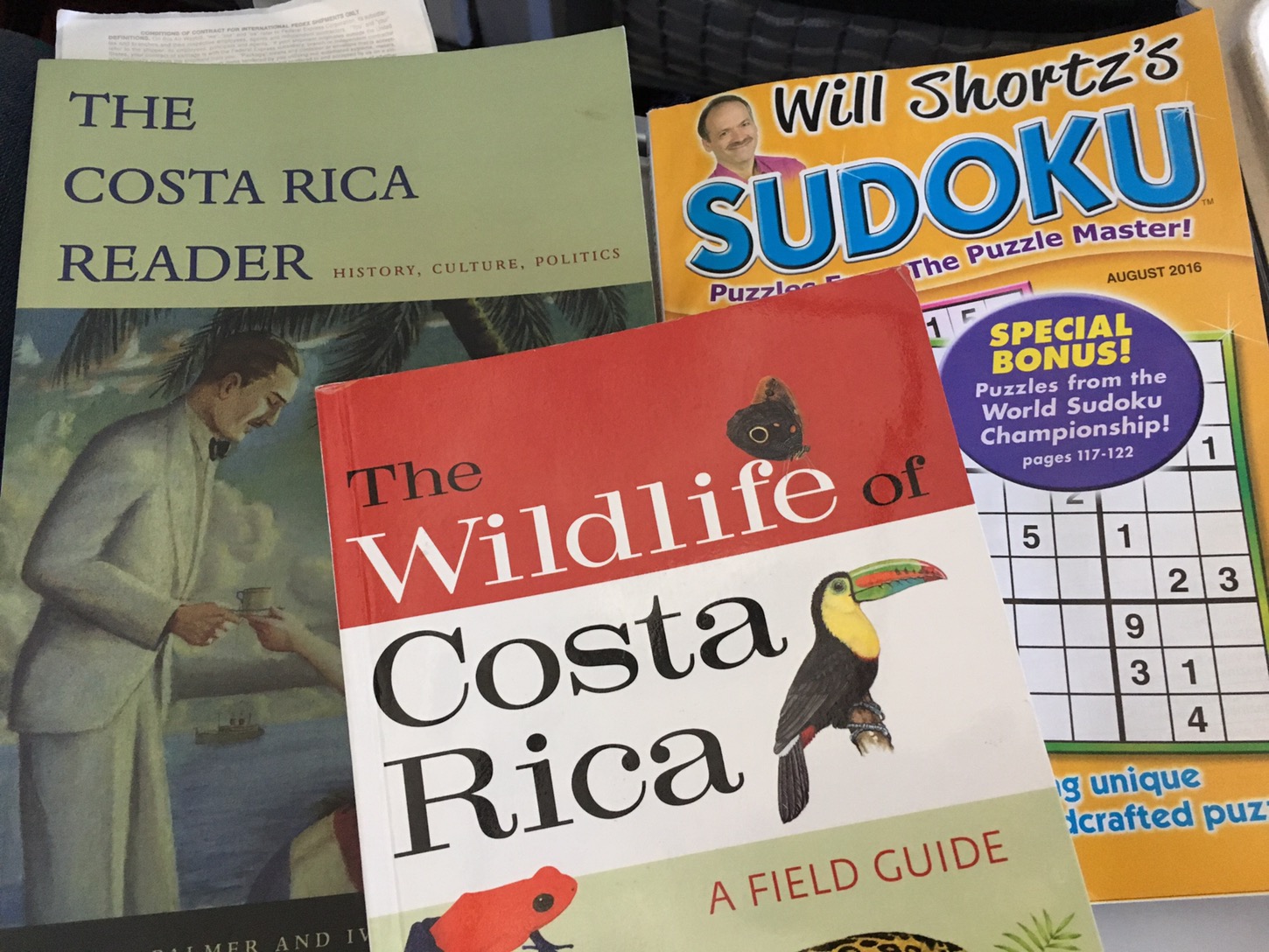 The 737 was fully loaded, mostly tourists headed to Costa Rica. The taxi lane for take off was packed. We sat in line for 30 mins, just waiting to take off. During the 5hr 3min flight, I flipped through Costa Rica Reader, Wildlife of Costa Rica, Spanish for Costa Rica, and did a bunch of Sudokus. I slept a tiny bit and ate lots of snacks and another breakfast. M slept and read books too. When we arrived above San Jose Costa Rica, there were thunderstorms so the plane circled for about a half hour and then dipped in to land. Immigration and customs was a long line but it moved pretty fast. We metanother family from SoPas in line. M recognized one kid from SPHS.