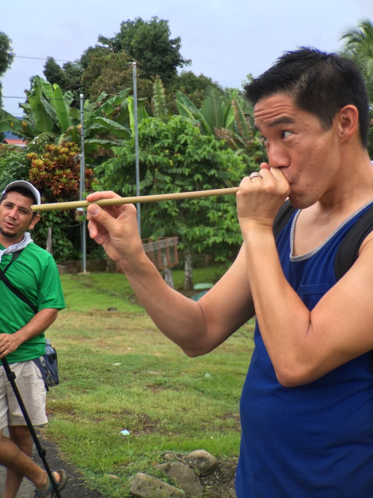 For lunch we went to a local house and Judy taught us how to cook a local dish. We softened banana leaves over open flame as the wrapping for the meal. We cooked a beef and yuca stew. We pounded out handmade tortillas. We sautéed spices with the black beans. And we fried local eggs and plantains. Lauren and Madeleine played foos ball with Judy’s young boys while the other group cooked their lunches.