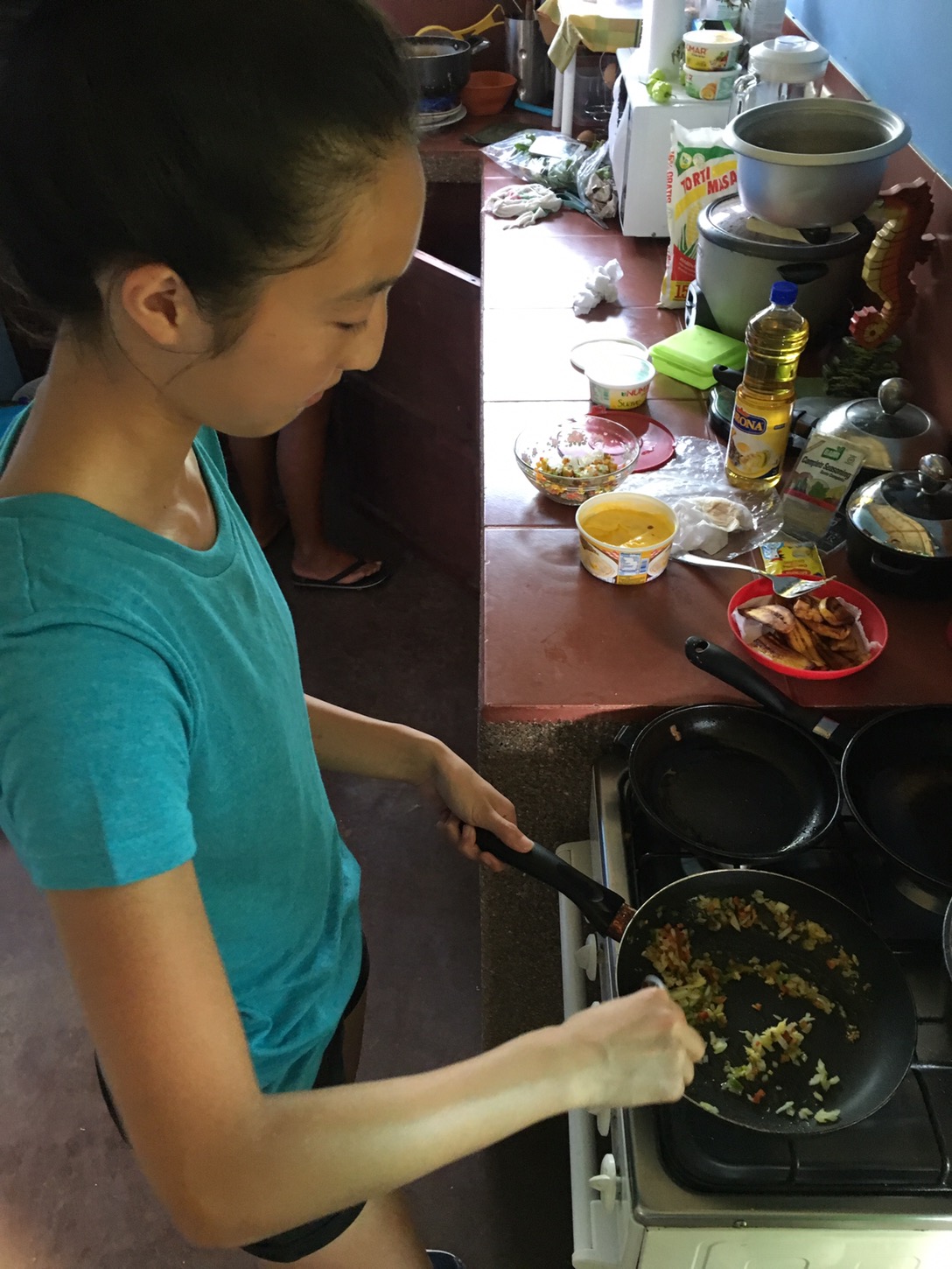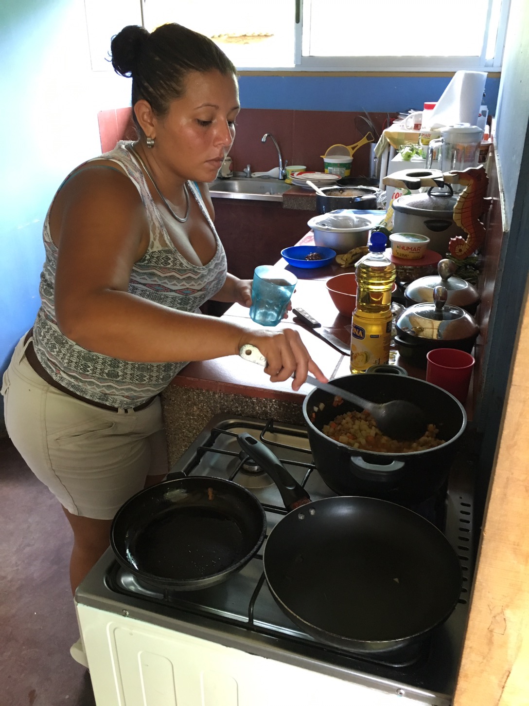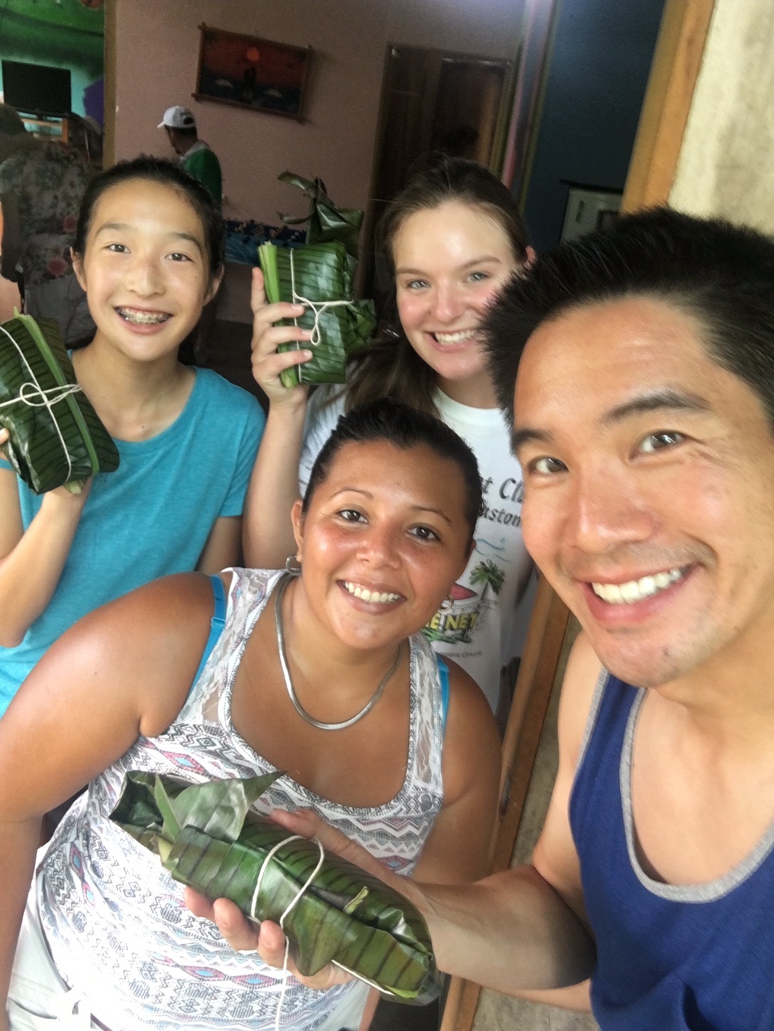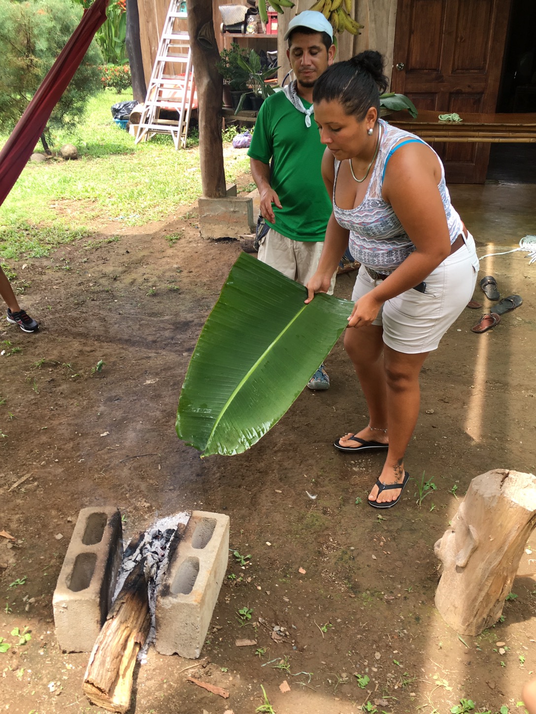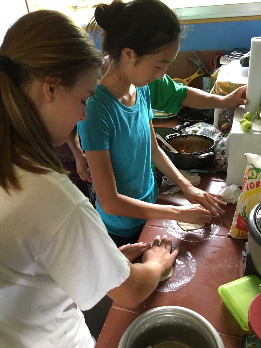 For lunch we went to a local house and Judy taught us how to cook a local dish. We softened banana leaves over open flame as the wrapping for the meal. We cooked a beef and yuca stew. We pounded out handmade tortillas. We sautéed spices with the black beans. And we fried local eggs and plantains. Lauren and Madeleine played foos ball with Judy’s young boys while the other group cooked their lunches.