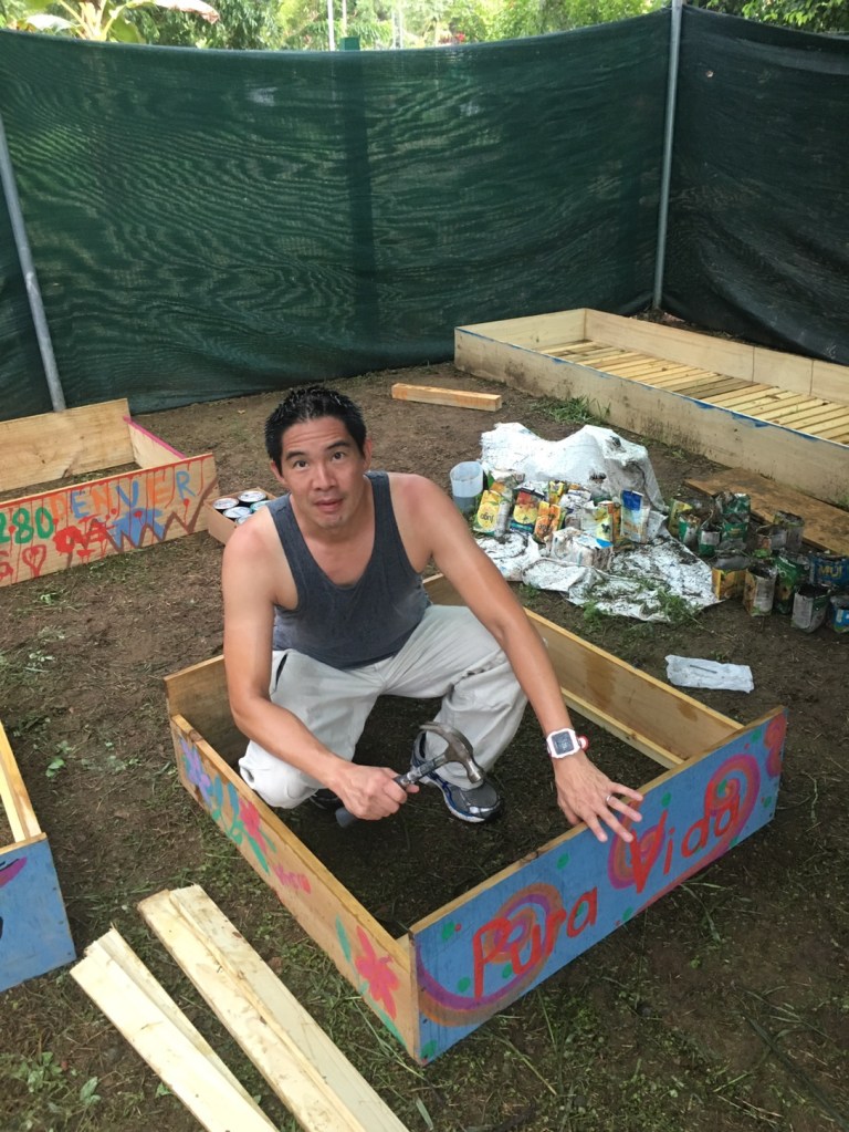 Reforestation Project. After lunch we walked back to the farm and did our Community Service project. Miguel donated space on his farm for the Reforestation Project. He will plant 10% of the trees grown on his local property. The project grows indigenous trees from seeds and plants them around the community. The trees prevent erosion by the beaches and rivers. The trees provide birds and animals new habitats to live. The trees create more oxygen for the planet. Our part was to build boxes in which the seeds cartons are stored. We cut wood. Nailed them together and painted them. The boxes will not only grow the seedlings into trees but also the boxes fit into trucks that can distribute the trees for planting. It was some hard work and then it started to rain. I was dripping from the sweatband the rain. I was mostly hammering the bottom slats of the boxes. Madeleine was mostly painting the boxes. A few hours of that and we were pooped out. We walked back to the hotel and it really started pouring rain. We had dinner and then went to bed early.