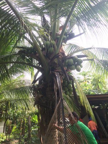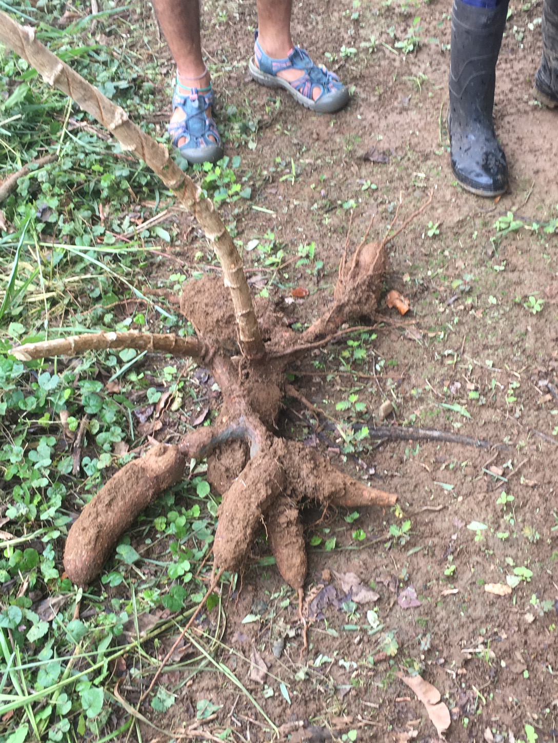 Pineapple, guava, mango, papaya, banana, Heart of Palm, avocado, bean trees. We tasted his fresh bananas off the tree. We sipped fresh coconut water out of a fresh coconut. We tasted the fresh heart of palm that Miguel hacked off. Miguel dug up a yuca to show us the potato like root.