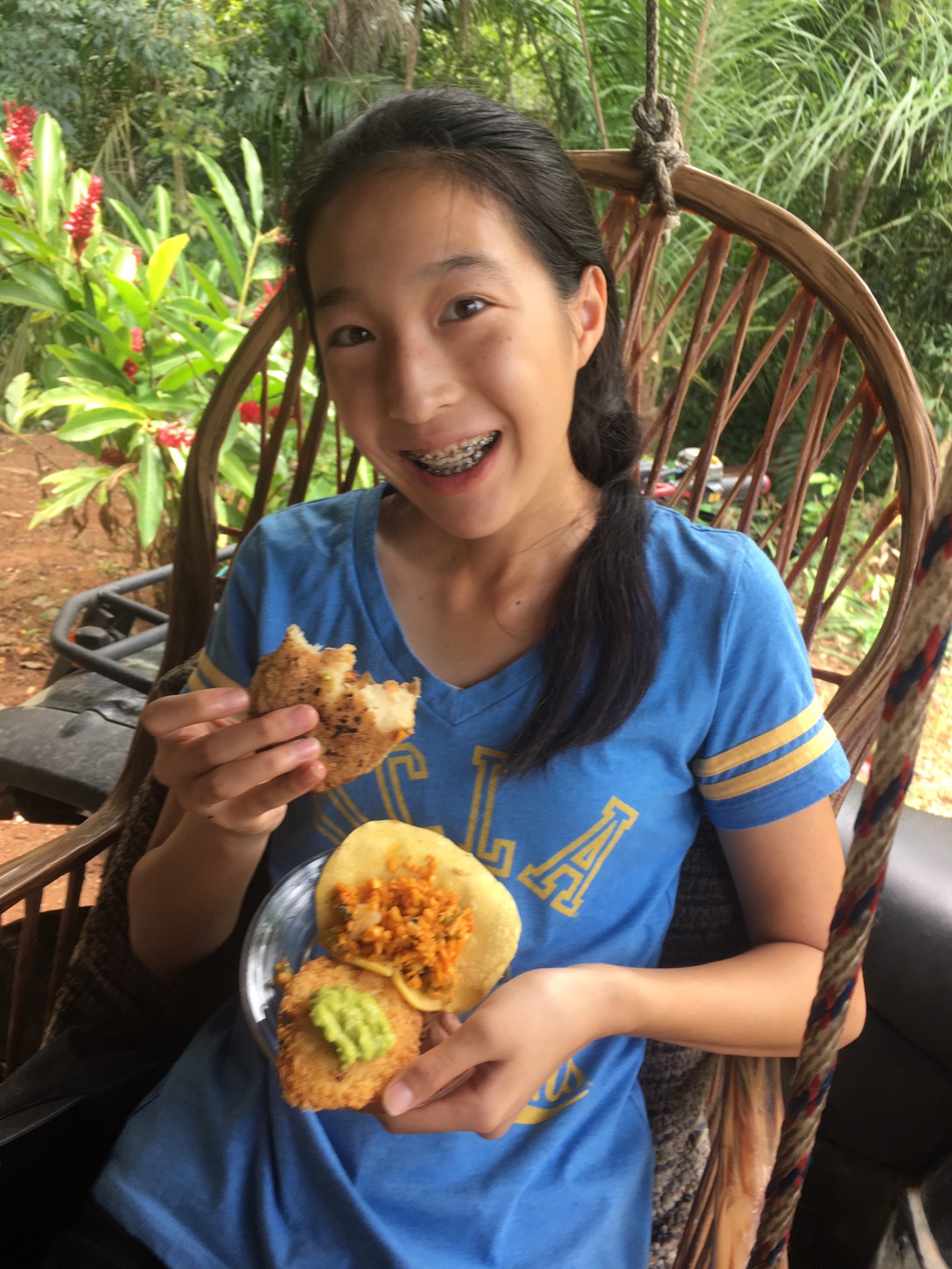 We hiked through the rain forest up to the top of the farm where Miguel’s wife cooked up some local snacks for us. Yuca pancakes with guacamole, fried yuca balls with rice and beans filling. Tacos. Horchata. Lemonade. Sweet rice dessert.