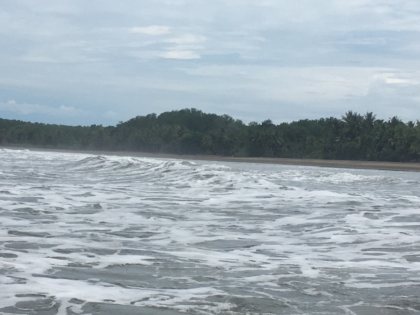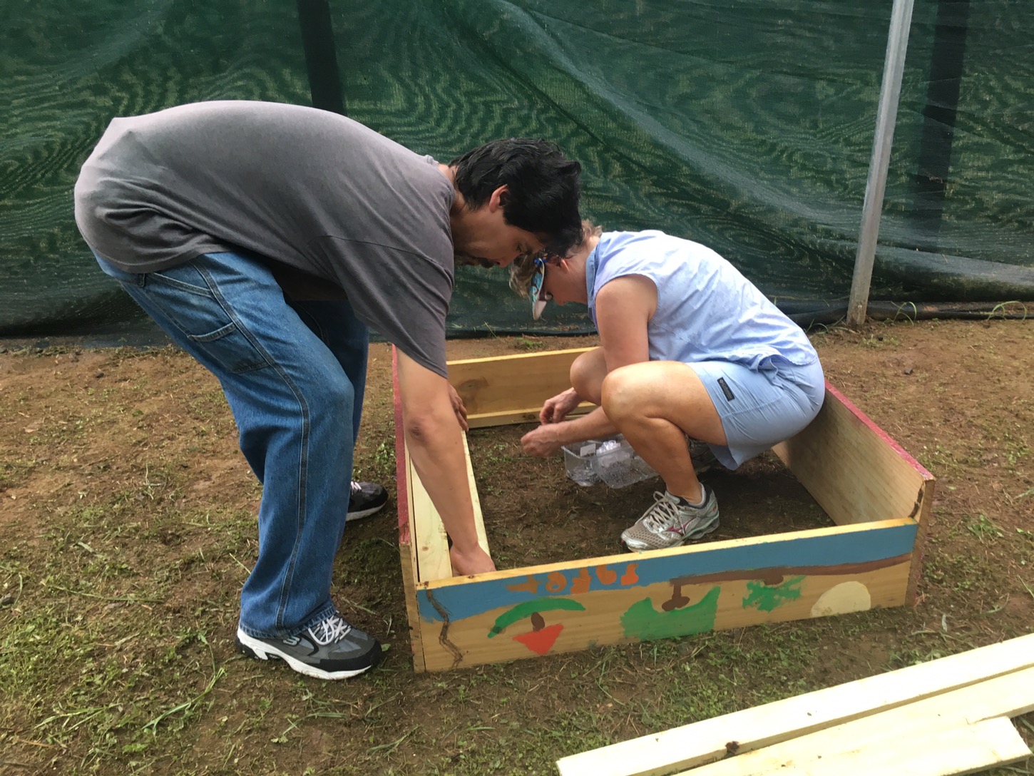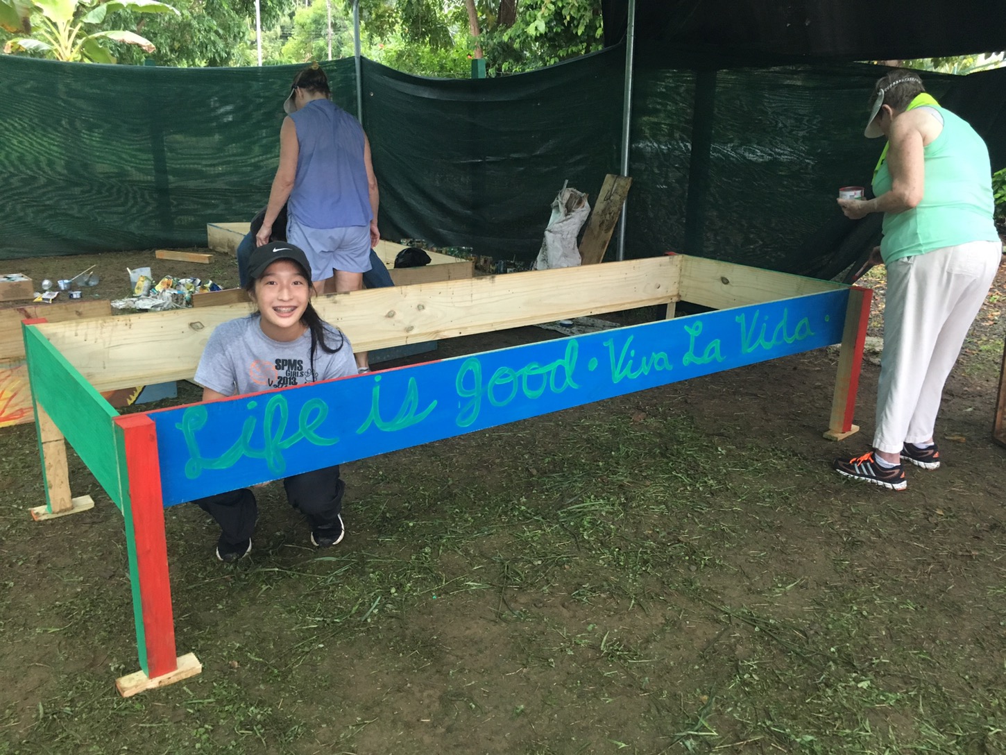 Reforestation Project. After lunch we walked back to the farm and did our Community Service project. Miguel donated space on his farm for the Reforestation Project. He will plant 10% of the trees grown on his local property. The project grows indigenous trees from seeds and plants them around the community. The trees prevent erosion by the beaches and rivers. The trees provide birds and animals new habitats to live. The trees create more oxygen for the planet. Our part was to build boxes in which the seeds cartons are stored. We cut wood. Nailed them together and painted them. The boxes will not only grow the seedlings into trees but also the boxes fit into trucks that can distribute the trees for planting. It was some hard work and then it started to rain. I was dripping from the sweatband the rain. I was mostly hammering the bottom slats of the boxes. Madeleine was mostly painting the boxes. A few hours of that and we were pooped out. We walked back to the hotel and it really started pouring rain. We had dinner and then went to bed early.