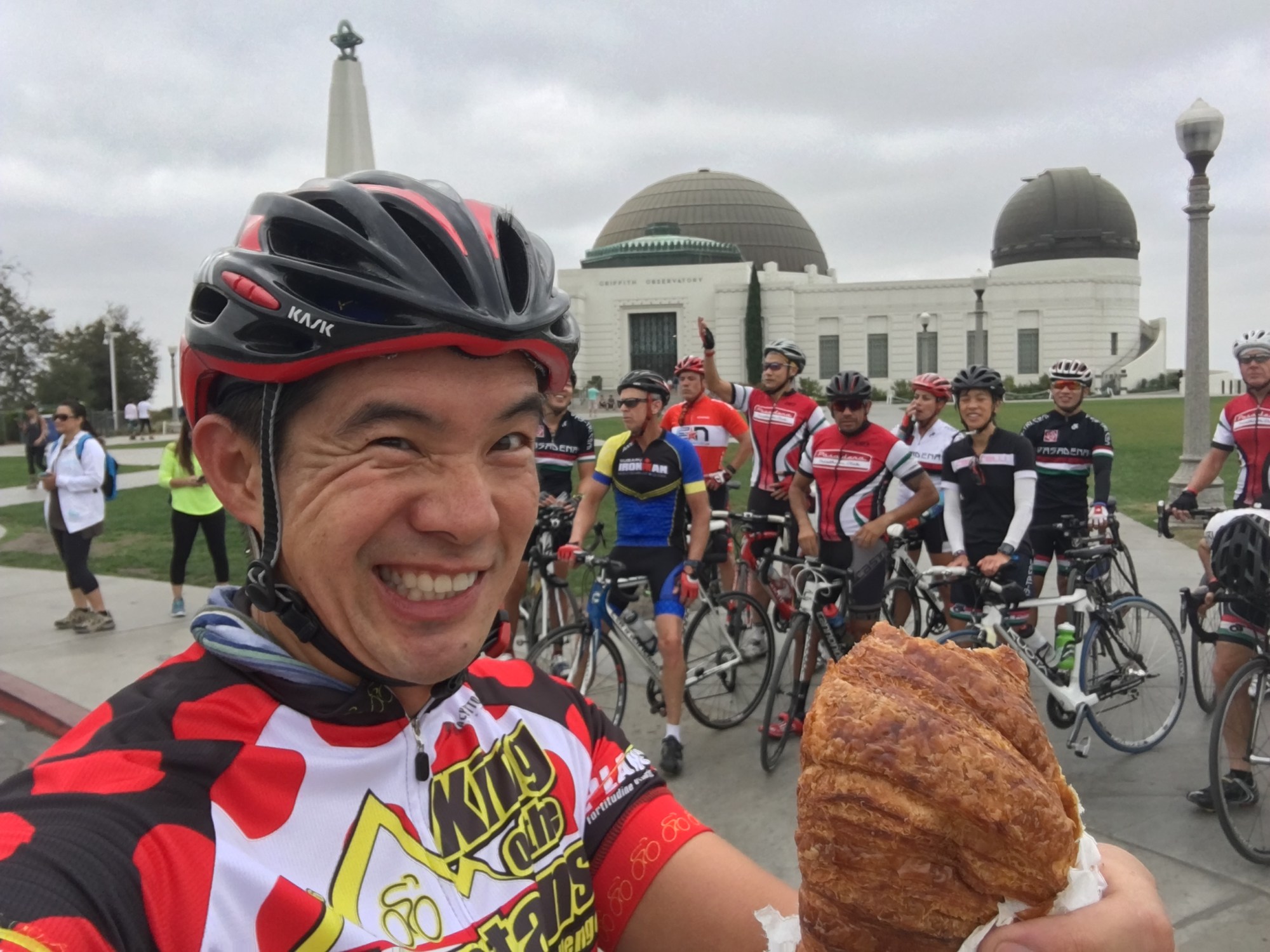 We had a good crew out for a short and lively ride through Pasadena, Eagle Rock, Glendale, and LA, up to the Hollywood Sign and Griffith Park Observatory. We went down the front side to Los Felix and rode the Los Angeles River Trail then headed back to Jones Coffee. Weather was a little overcast. The sun broke through later in the morning. I had bought a croissant at Jones before the ride and ran out of time to chomp it down, so I stuffed it in my jersey and enjoyed it at the top of the ride.