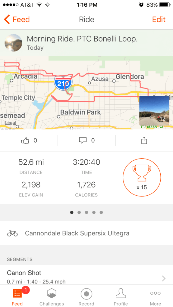 52.6 miles, 2,198 ft elevation, 15 Strava trophies.