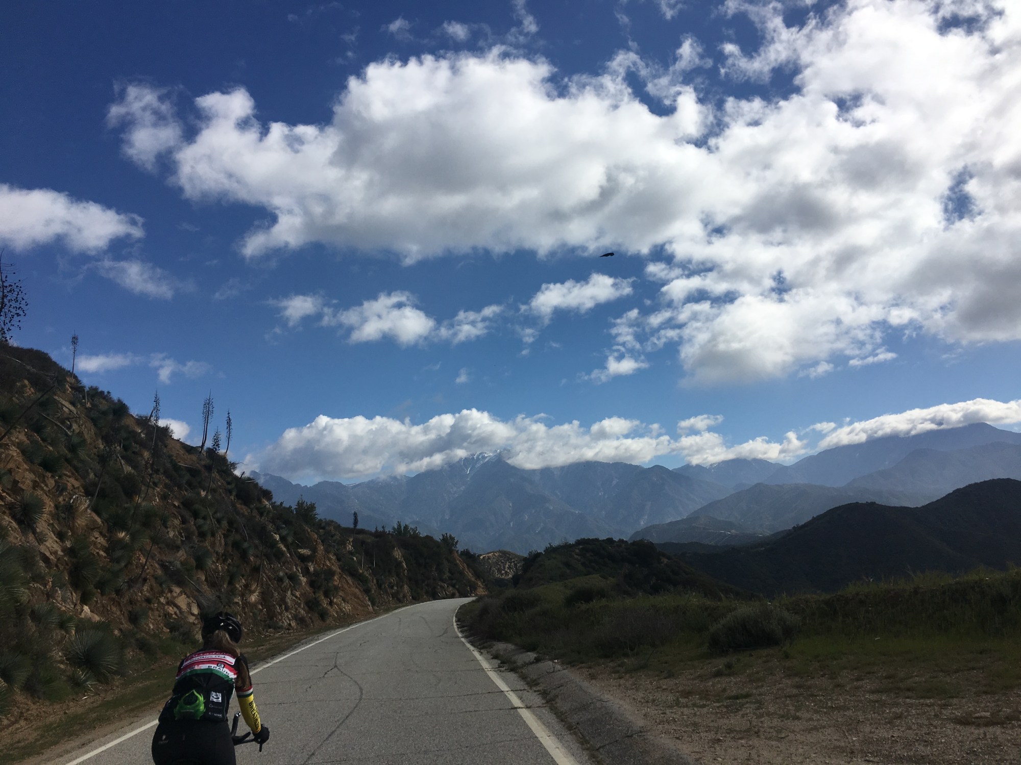 Today was a beautiful day for a ride. Bright and sunny, cool and crisp. Then, puffy clouds popped up and then dark clouds rolled in. I had missed mountain climbs in much of the winter due to rain or running. I was focused on the LA Marathon, so sometimes I just chose to do a long run instead of riding. Now, it was time to get back up there. This is a big boy ride up to Mt. Baldy. My legs were not fresh. I knew from the first mile, this was gonna hurt. The PTC crew GT, Bob, Steve, Lynda, Bill, Dino, Joe, Ryan, MikeG, PeterD, started from Sierra Madre and had a pick up in Duarte Tiff, Gregg, MikeW. We took the San Gabriel River Trail north for a bit then took Foothill to Glendora Mountain Road (GMR). GMR is a great Time Trial, 8 mile 5-6% grade. We broke through the clouds on the way up. We met some Volt friends at the ridge, Tyler, Kirk, Craig, Mandy. They were riding the other way. The group had broken up, since I was so slow. Lynda and I took off along the ridge to Baldy Village. It was a long slow slog to the top. The crew was snacking at the lodge. Some had already turned around and headed back. It was a long day for everybody, and waiting around for me was asking a lot. The ride back was bad but not too bad. The uphills were definitely slow. I really enjoyed taking the trees and sky. It was a great day.