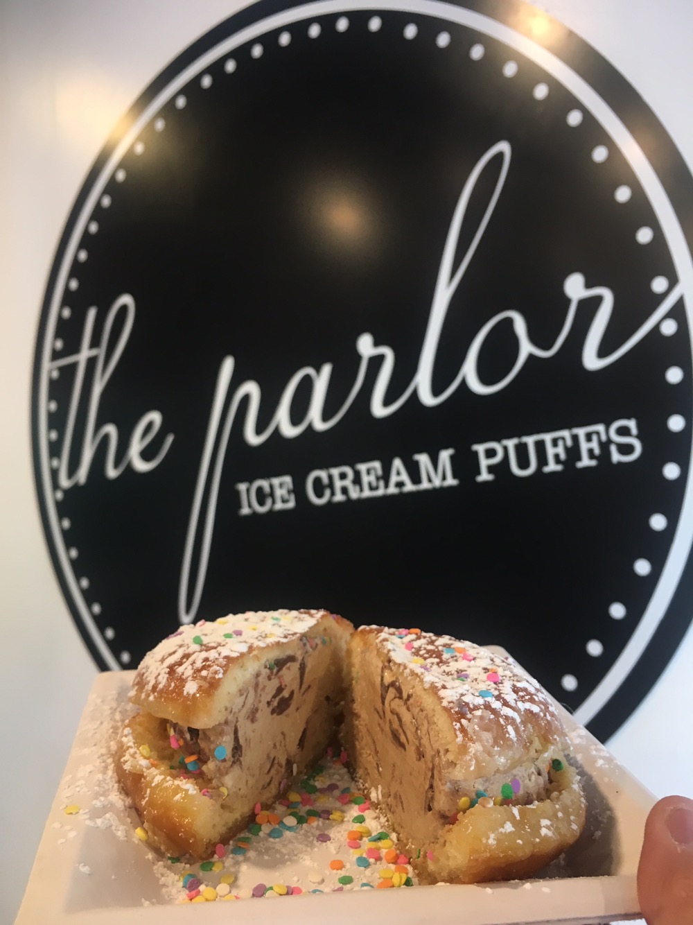 My daughter and I had to stop for a snack. Midnight in Paris (Coffee ice cream with Nutella swirls), stuffed in a glazed doughnut! The Parlor in Sacramento. Yum.