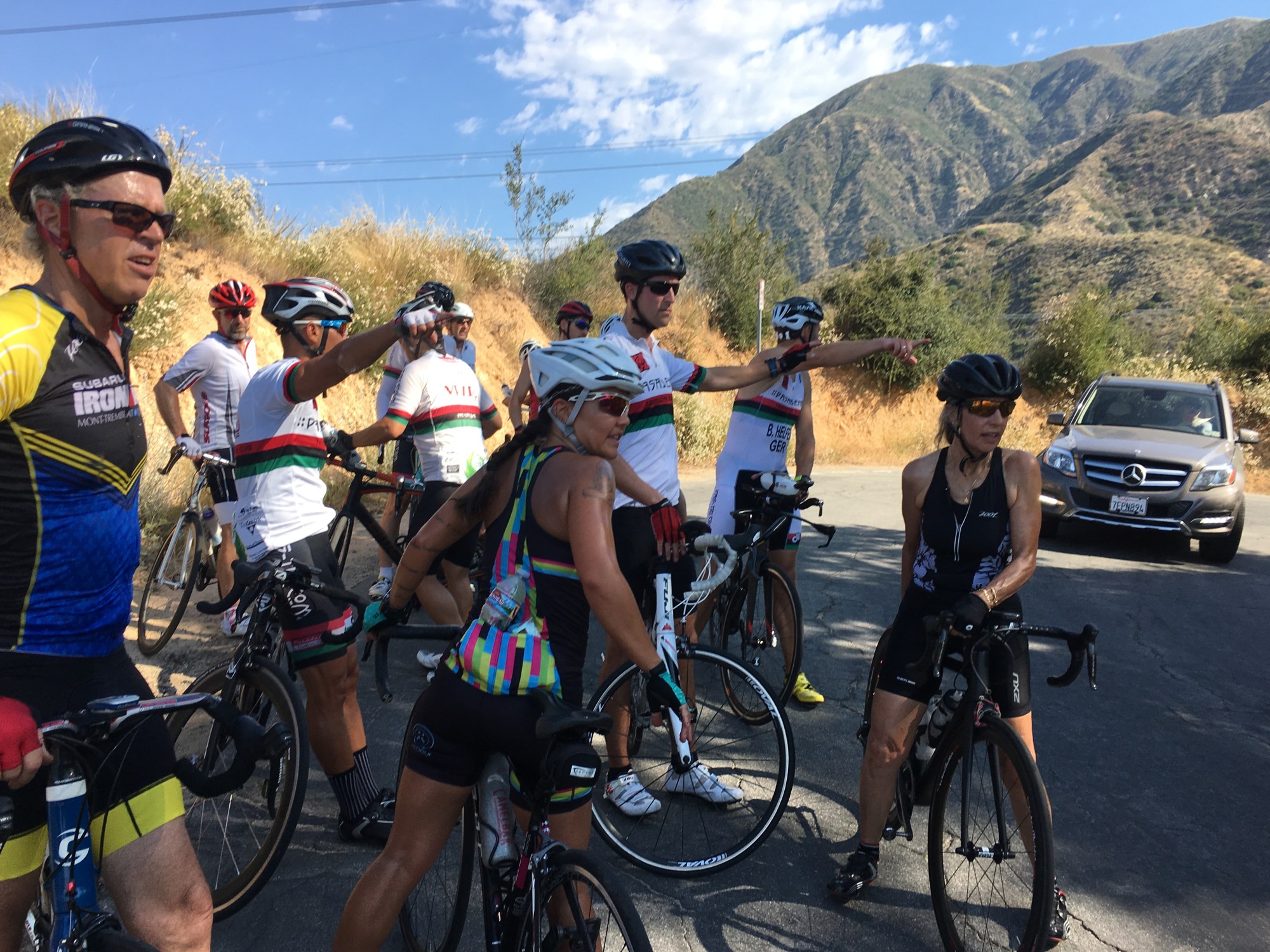 In the hot LA summer morning, the club rode the resolution route. We met at Jones Coffee at 7:30am and it was already 80F. The route winds around the edges and hills of Pasadena, La Canada and Montrose. We rode east along Walnut, then up Easton Canyon to the top of Lake Ave. Then, we rode up the very steep Chaney Trail. West around JPL and up to Descanso Gardens. Northwest up Foothill, a long slow climb. Then a speedy descent through Montrose and Glendale. One last climb over Chevy Chase and Linda Vista. After an agreement that it was way too hot to go up Arbor, some still went up and over Arbor. By the time we finished my Garmin read 102F (39C)! We recovered at Jones over iced coffee and stories of triathlons.