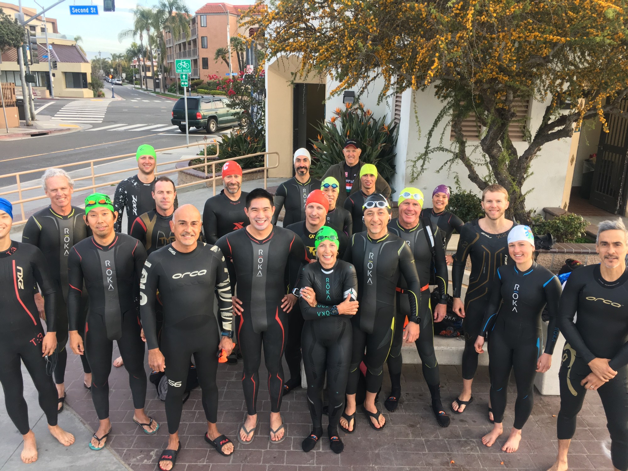 Since there was a bunch of rain this week, the water situation was iffy. We checked out the water quality sign and got the green light. No sense in getting sick a couple weeks before Oceanside 70.3. Scott gathered the troops and gave us the lay of the land, er water. We swam along the buoys for 1000 yds, and flipped it. The water was COLD (55 -60F). I tried out my new thermal hood from Roka. It worked well. My face and toes were kinda numb during the first 300 yds, then it was set.