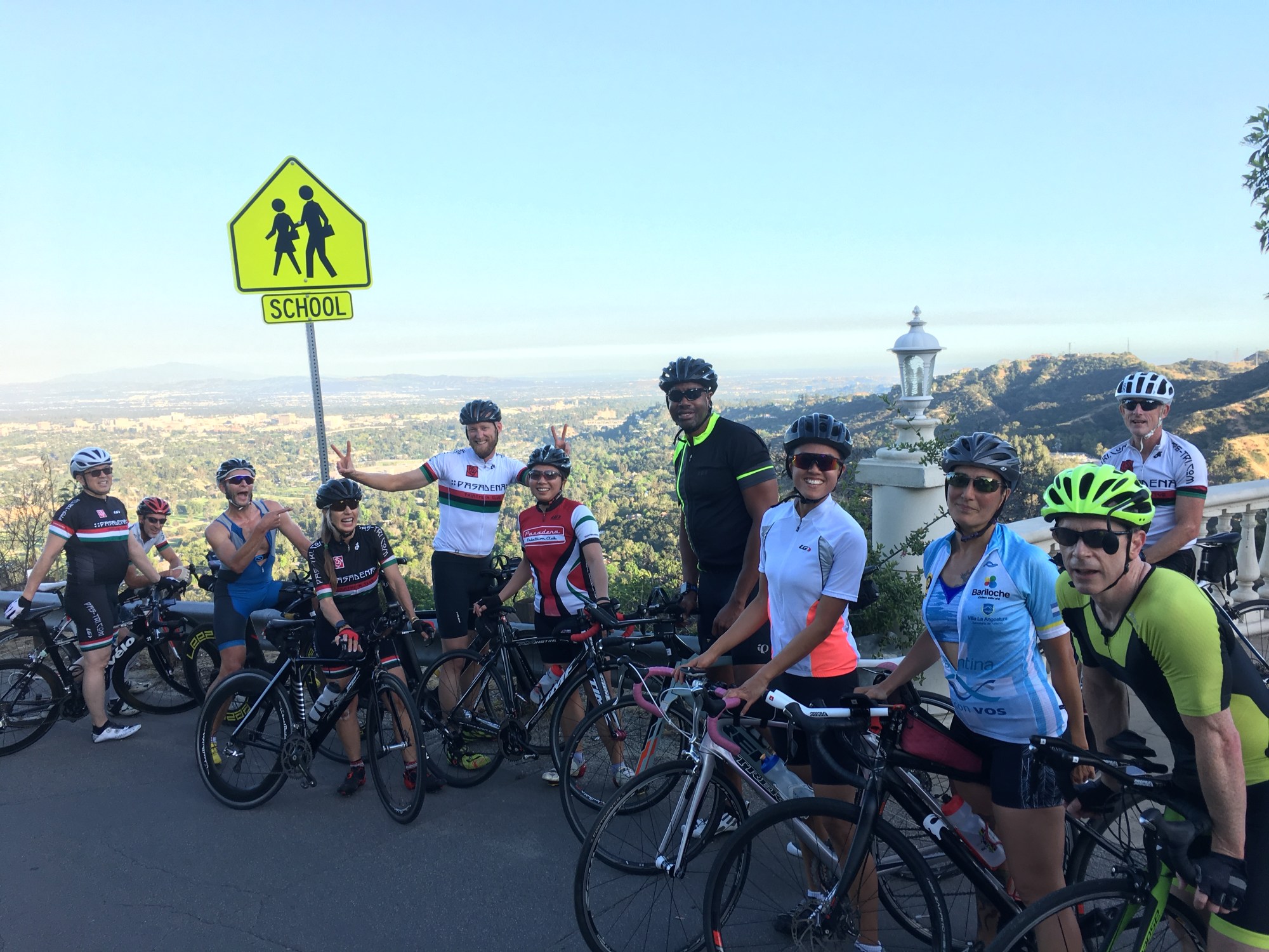 On a perfect spring afternoon, the Club rode through the hills of Pasadena and La Canada. Starting with two social laps around the Rose Bowl, the Club rode up Salvia, north Linda Vista, then climbed up up up. Up Devon > Braemar > Inverness > St. Katherine. We took a selfie at La Canada Flintridge Sacred Heart private high school, overlooking the Arroyo. Then, we zipped down the east side to Chevy Chase, and up Descanso, and back to the Rose Bowl, which was gearing up for Taylor Swift Concert tomorrow night.