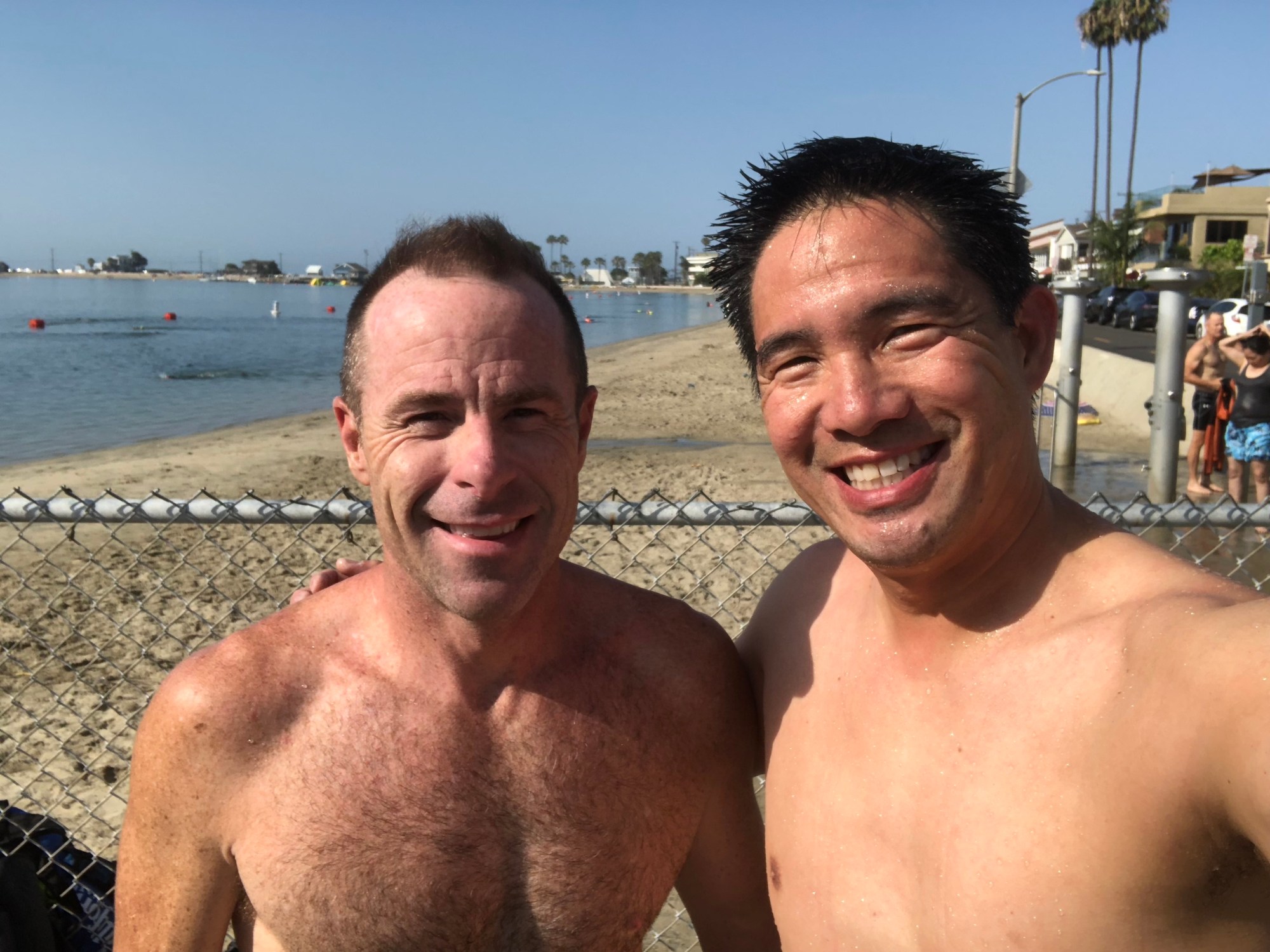 On a hot summer Sunday Morning, I met my friends at Long Beach’s Belmont Shore. We swam around the smaller Naples island and then back. I wear a floatie with my phone in it. The floatie is highly visible. I also wear a highly visible orange cap. When I do wear a cap, I tend to overheat. I was definitely sweating for awhile after the swim.