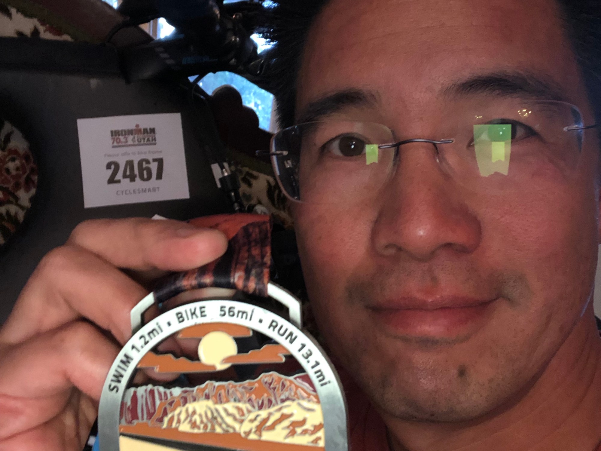5:15am ish. Board the shuttle bus, right outside T2. 25 minute bus ride 20+ miles to Hurricane, UT, at Sand Hollow Reservoir. It’s still pitch black when we get out of the bus. Clean Transition setup means that the T1 has a couple staging areas. At Swim In, you walk to the racks and pick up your Bike Bag. There is a Changing Area, with sets of folding chairs to change into your bike gear. Then, you drop off the Bike Bag to the volunteers and run to your bike. There is no transition stuff at the bike racks. So, in the morning, we loaded our bike computer and put all the nutrition on the bike. Pump up the tires. Then, load up the Bike Bag with other clothing. The take home story here, is you have to plan each Bag wisely. No mistakes. This race, I did pretty good. I only forgot a white cycling jersey at home. I had a black one with me, but I thought that would be too hot on a hot bike day. I also had a vest in the Bike Bag in case it was still chilly after the swim. Special thanks to Alvin, for letting me borrow his white PTC jersey. Perfect. I borrowed Lynda’s bike pump and pumped up my tires. I chose to swim bare chested under the wetsuit. Then, put on a PTC cycling jersey for the bike, then switch to a light PTC running shirt for the Run.