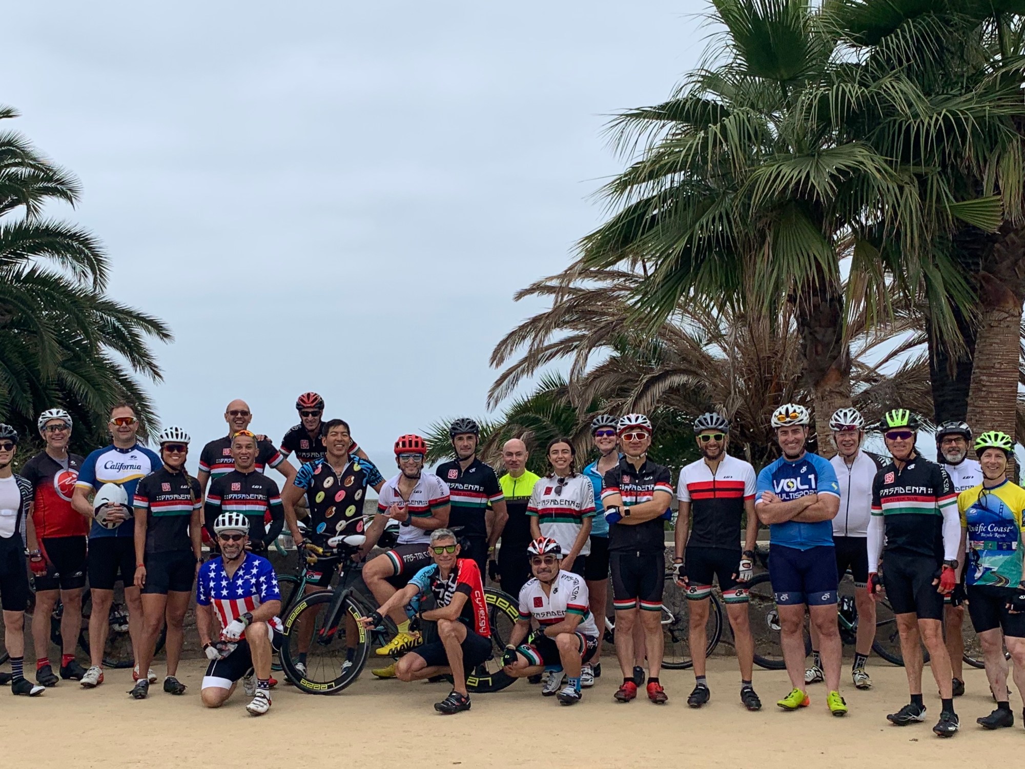 Cool summer morning. Cloudy until the last stretch home. Early start 7am. We started from Eagle Rock and rolled through Glendale, Burbank (picked up GT, Julie and Michel), Toluca Lake, Sherman Oaks, along Riverside Drive. We turned south on Van Nuys and then rolled west along Green Leaf. Then, turned up Sepulveda (picked up Todd!!!) and over the Pass. This was the only big mountain along today’s ride. Tunnel at the apex. Then a long descent along Sepulveda, right next to the 405 Fwy. Top speed 37.8 mph. Passing the Skirball Center, Getty Center, VA Cemetery. We took a short cut through the VA lot, passing the UCLA Jackie Robinson Field. We rode down San Vicente, all the way to Ocean. The bluffs above the Santa Monica Beach. Awesome. Bit cloudy, but we could see the water and waves. Potty and snack stop. Took a big picture of the crew and headed back. The crawl back up the Sepulveda pass was not as bad, with the cooler weather. Along Green Leaf, the club got split into several groups. First group got to Van Nuys and waited and waited. Turns out Grazi took a spill on one of the road cement seams. He had some road rash and rolled on (and yes the new Bianchi is okay too, minor adjustments needed). While we were waiting for Grazi to get back rolling, there was 6.0 earthquake. We were standing by a strip mall with a huge sign that started swaying. And a delivery truck started shaking to. Our friends came up and they said they didn’t feel anything, cuz they were rolling at the time of the quake. Welcome to California. We rolled through Burbank along the Warner Bro. Lot, and Disney Studios and ABC Lots. Got back to Eagle Rock about 11:45am. Plenty of time to get back for BBQs and Fireworks. Happy 4th of July!