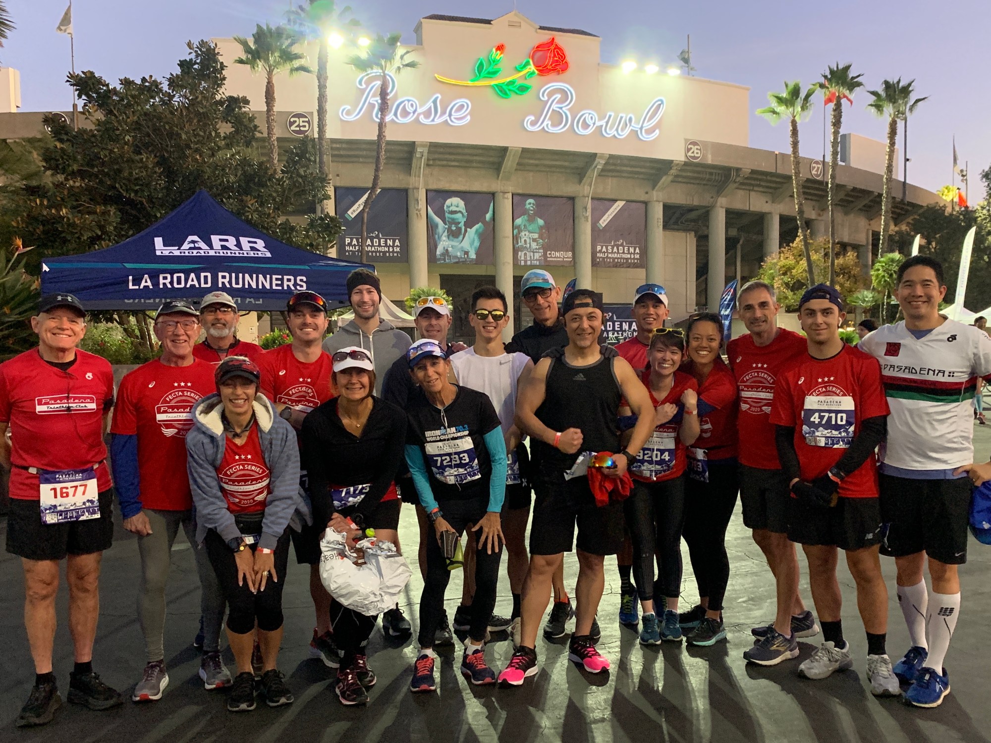 The Club met at zero dark thirty at the Rose Bowl Stadium. Fortunately, Lynda has friends at the Pasadena Pacers, who let us crash their Rose Bowl Locker Room privileges. Nice and warm. Clean bathrooms. Warm up time. It was awesome for gear check place too. Thanks, Carol!