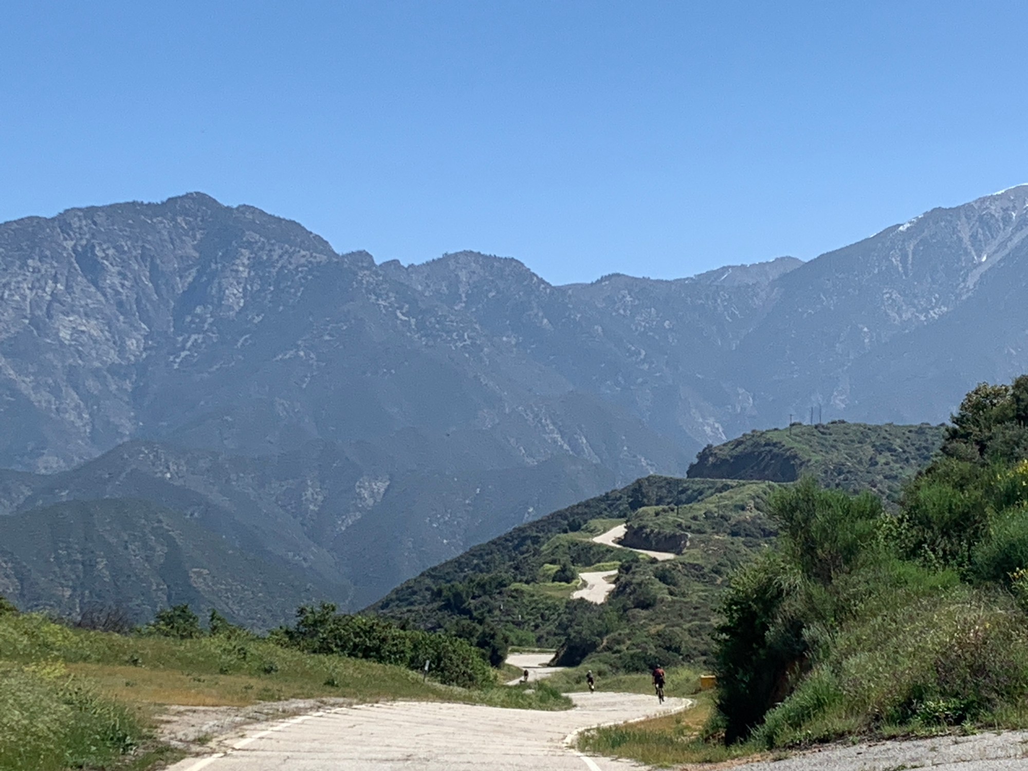 I rode with a few friends up to Mt. Baldy. We met in Sierra Madre We rolled to Encanto Park in Duarte, where a few more friends joined us. We rode up the San Gabriel River Trail a bit and along Sierra Madre to Glendora Mountain Road (GMR). The gate was closed to auto and moto traffic. It was an awesome climb without the usual buzzing of motorcycles. GMR front side is a 9 mile grade. At the top a few guys flipped it, a few guys went down the backside of GMR. We rode on Glendora Ridge Road (GRR). It’s a 12 mile steep climb. There’s a few dips, but mostly up. Gorgeous weather, blue skies, cool breeze. Along the ridge, you feel like you’re on top on the world. We got to Mt. Baldy Lodge. The lady was super nice. Lynda tipped her huge for the sodas and potty stop. While we refueled, we saw a couple friends that rode along the lowlands and up the front of Mt. Baldy Road from Claremont. Lynda was admiring Bob and my helmet hair. We flipped it and rode back the way we came. It was mostly down with some rollers along the ridge. The wind started picking up. Along the descent down GMR, the headwinds were noticeably pushy. The ride west back to Sierra Madre was definitely all headwinds. I was pooped by the time we got to Encanto. I took a couple breaks on the way back to Sierra Madre. We got a big snack and were back on speaking terms. hehehe. Mt. Baldy is always an epic ride.