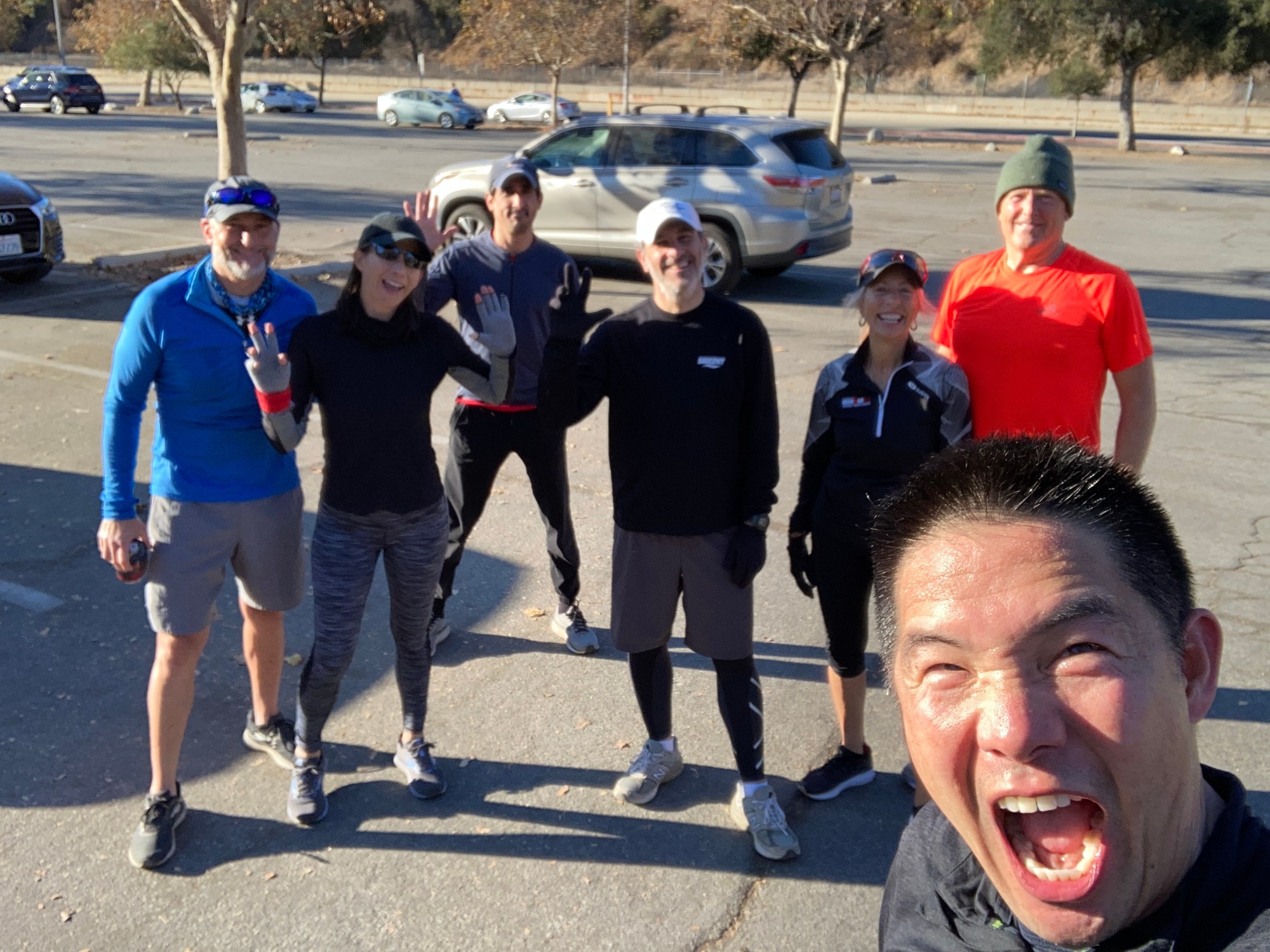 Hill repeats. On a cold, but sunny SoCal December morning, during the week of Christmas, I got to join the Tuesday morning fun run. Turns out ‘fun’ = Hill repeats to Lynda. We met at the Rose Bowl Aquatic Center and made a loop around the bowl. At each corner of the loop, we did hill repeats up and down, twice. The Rose Bowl sits in the Arroyo Seco, which is noticeably colder than the surrounding vista. So, each time go to the top it was a comforting warm end. Then, back down for some more work. Good work Runners!