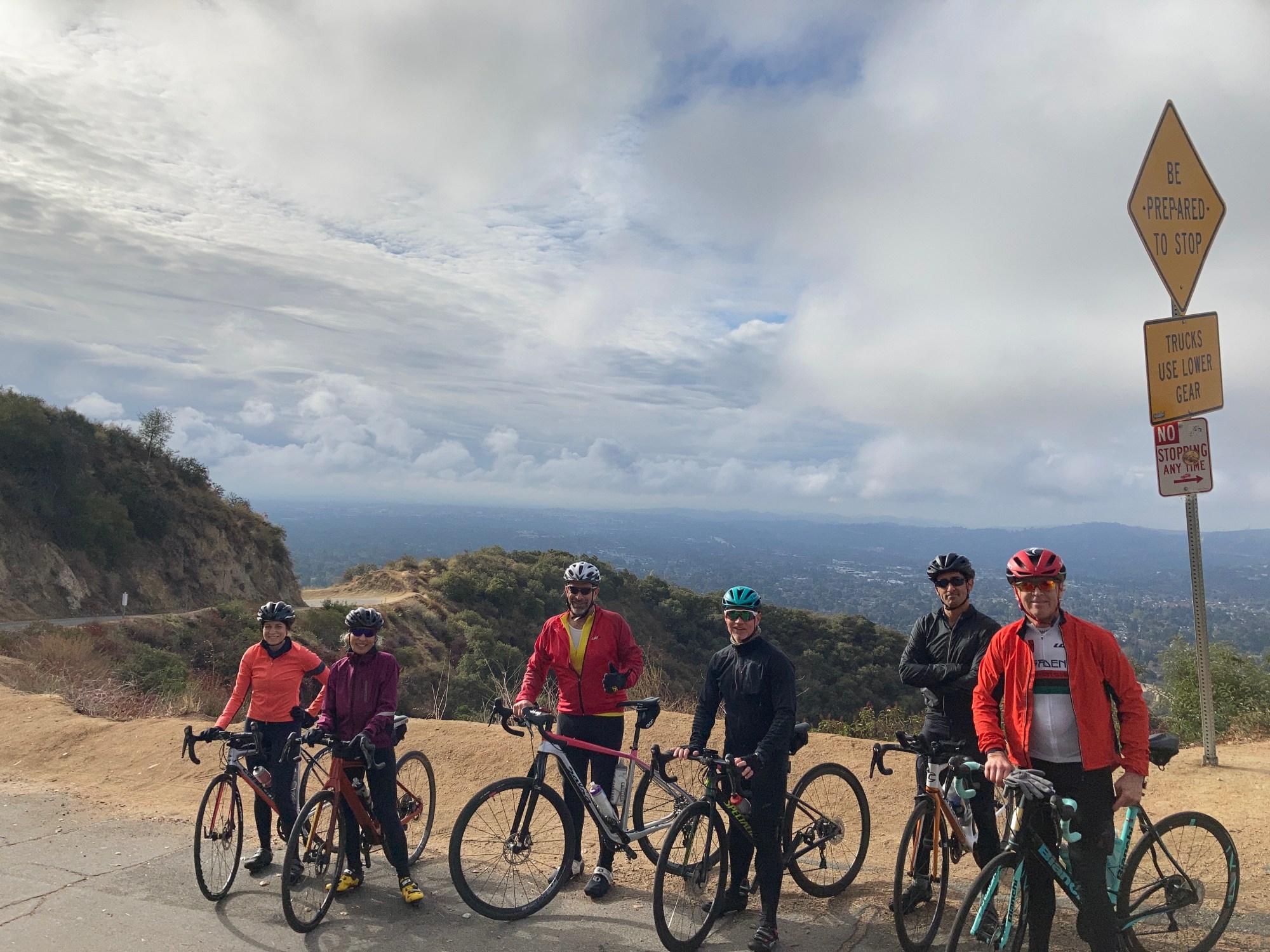 On a cold, blustery, wet morning, I waited for a preemptive email from Lynda to call off the ride. Cuz, our general policy is that we don’t ride on the rainy days. But, the email never came. We met at Jones Coffee. And at 7:30am, the ground was dry and the sky was holding back. So, we rode. We took to the old resolution ride around the edges of Pasadena. We rode east through Pasadena and up Sierra Madre to New York and wiggled up to the top of Lake Ave. We clawed our way up Chaney Trail and there was a bit of sun and blue skies. We kept riding across Altadena, and La Canada to Descanso. The skies darkened and the sprinkles started. We rode up Foothill and turned down Dunsmore. The descent through Montrose was real rain. The roads were wet. We got to Verdugo and there were votes to go home and vote to go back up Chevy Chase. I lost the vote count. I had dressed for cold. But found out the hard way, that my new thermal bib tights were not waterproof. Gregg had a mechanical at Holly, just before we finished. Got back to Jones cold and wet. Quickly drove home for a hot hot shower to warm up and a nap.