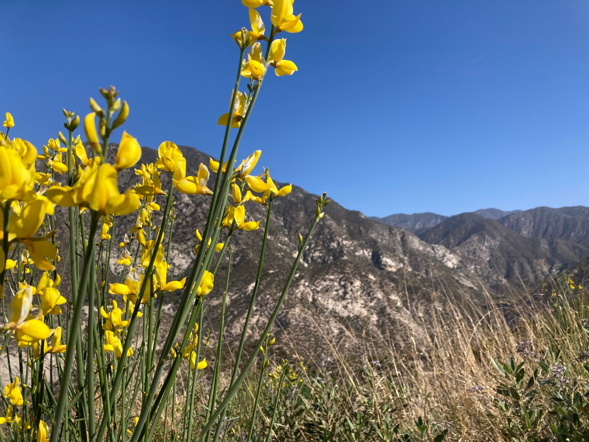 Mile 9: The clouds broke through to a beautiful blue skies. Whew. I’m glad it went our way. It was a long long constant climb from 6000 ft. a few cars, but a lot quieter than Angeles Forest Highway. That came later. We just kept climbing. Wild flowers were blooming and water was in the reservoirs.