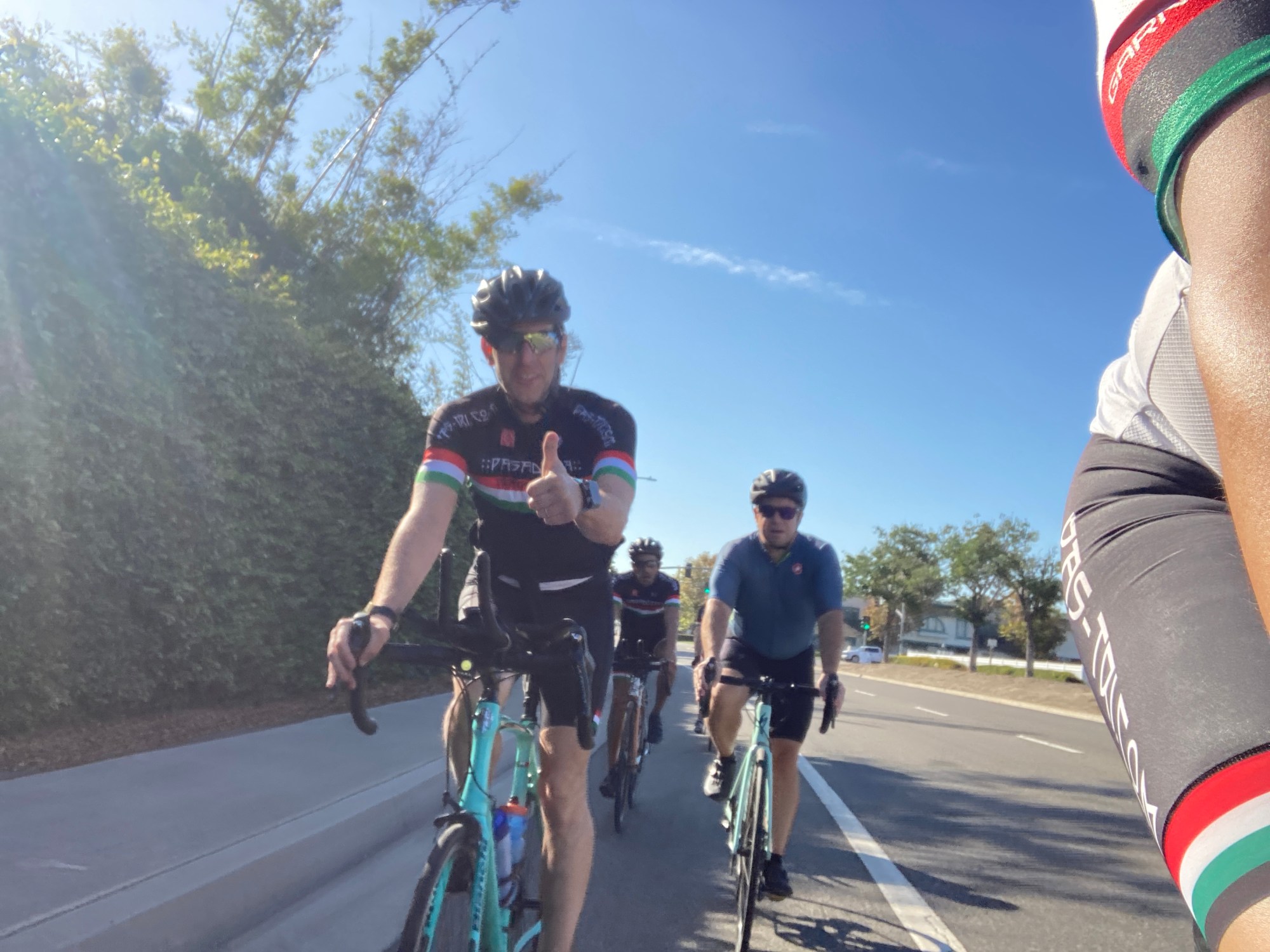 The club crossed the bridge at Duarte and then rode quickly down the whole San Gabriel River Trail. We exited the Trail at Pacific Coast Highway for about a mile to McDonalds for refueling. The sun started warming up on the way back. Overall it was a cooler and more enjoyable day.