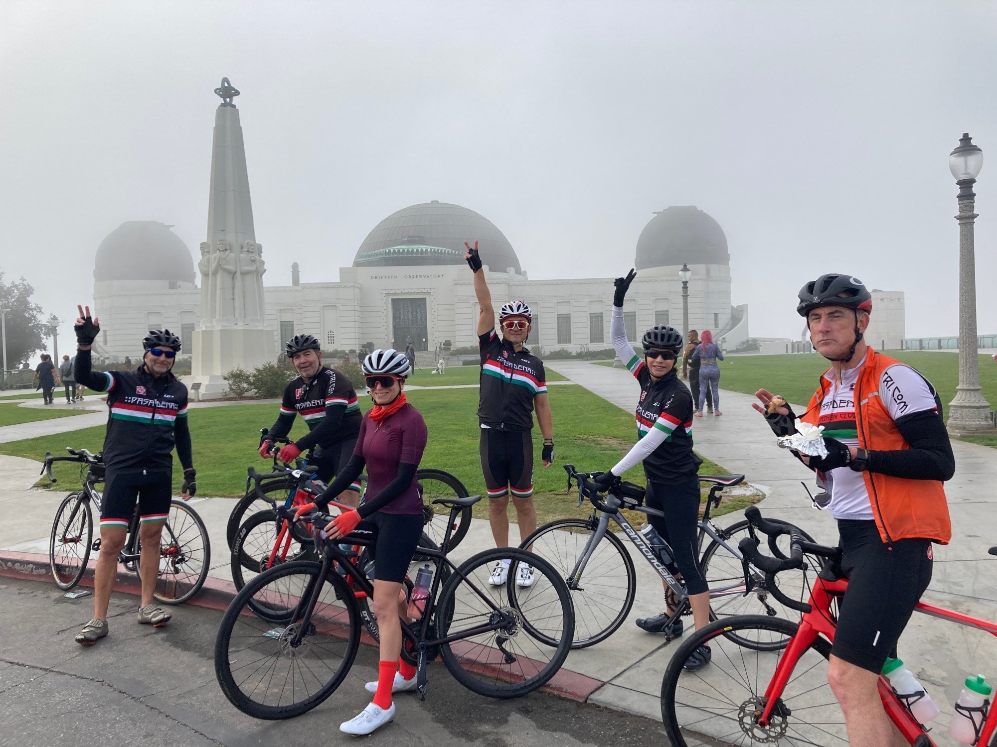 We had a great ride. We rode through Pasadena, Eagle Rock, Glendale. Then down to the Valley side of Griffith Park. Passing Travel town. The gate was open for some filming on the Hollywood side. I stopped for the typical Burbank Vista view, but it was only fog. We crested the top and went down the Canyon side down the Hollywood Side. Back up to Griffith Park Observatory. We went down the front side and i showed the crew a secret short cut through the Los Felix side. A little bit of dirt on the Silver Lake Blvd. to Los Felix Drive. We rode down the LA River Trail. I was doing so well with my directions for this morning’s ride, and blew right past Fletcher Dr. I had to stop and flip it. Sorry guys. We rode back through Eagle Rock and Pasadena. The stint up La Loma reminded me of the Oceanside 70.3 steep climbs. Very similar: 1/4 mile with 12% incline. As if that wasn’t enough and in honor of Lynda, we detoured to Arbor for a final push. Photo evidence below. Coffee and snacks back at Jones Coffee. Yum. Great ride.