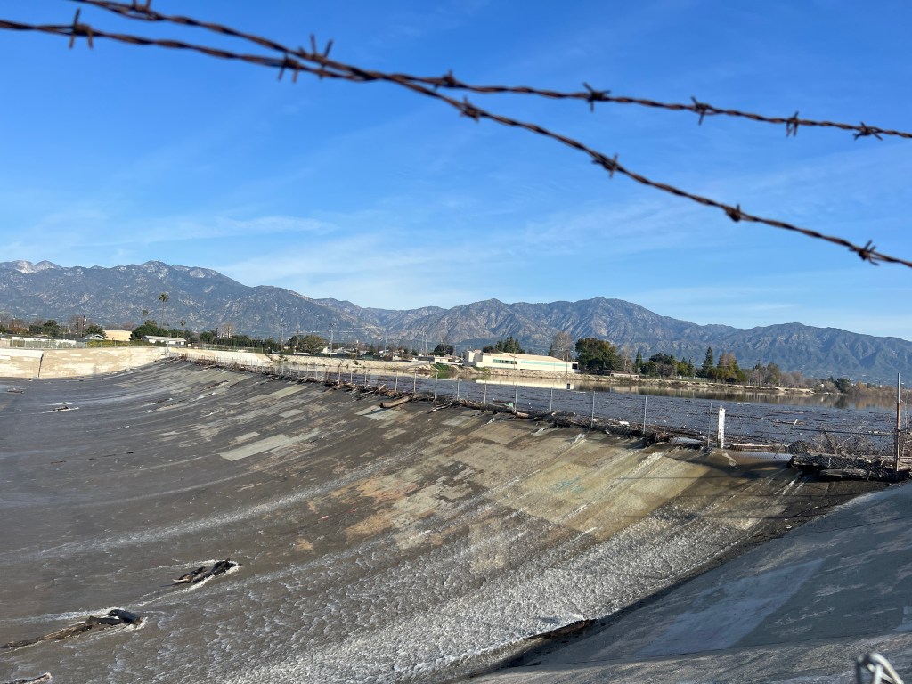 Mile 11: Ride along top of Santa Fe Dam. Lots of water releasing from dam and water was flowing throughout the flood control. Everything was uncharacteristically green.