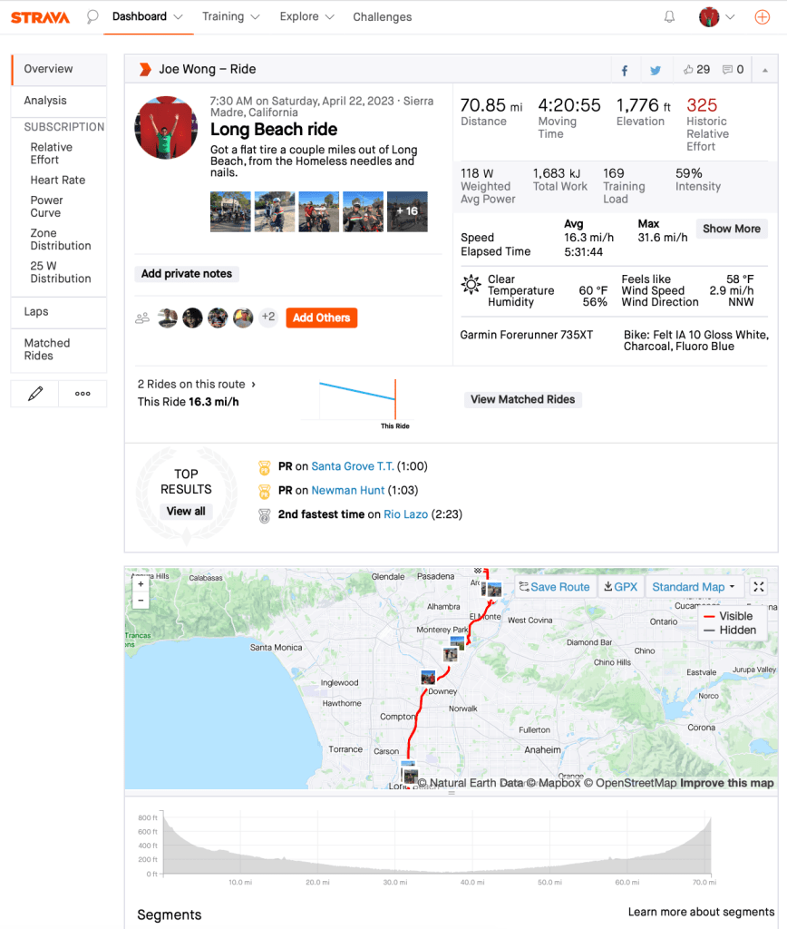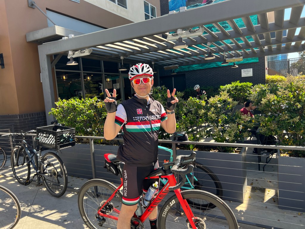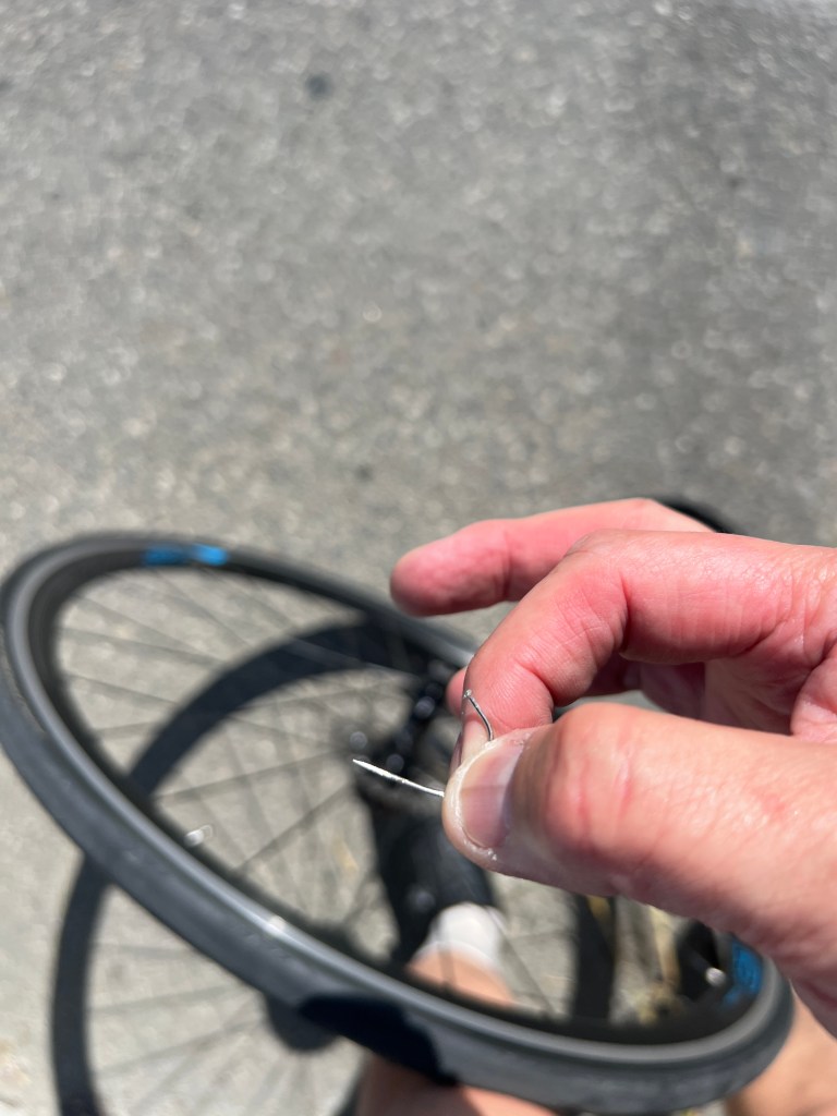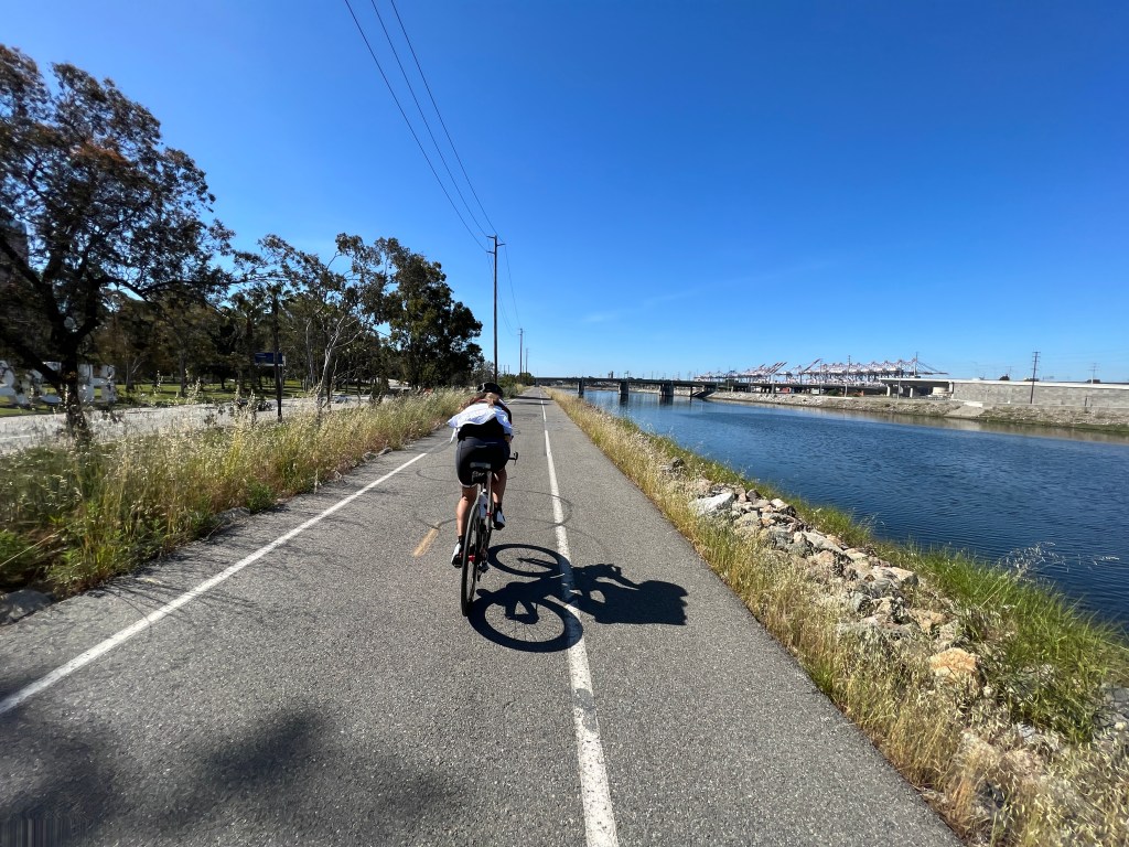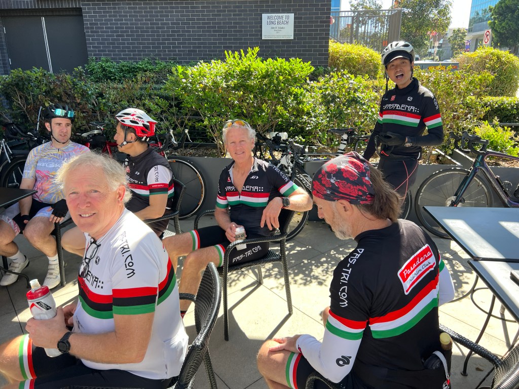 Mile 30: While passing a homeless camp, I rolled over some syringes and got a flat tire from a long thin nail. I was in the front of our pack riders. Phillip hit his brakes then Trevor, traveling behind Phillip, hit Phillip. Both guys went down. They could walk it off. Unfortunately, Phillip’s bike suffered some damage. He was able to roll the last few miles to Starbucks in Long Beach. I fixed my flat. Small puncture, didn’t need a boot; just replaced the tube. The sun was definitely high in the sky and warm.