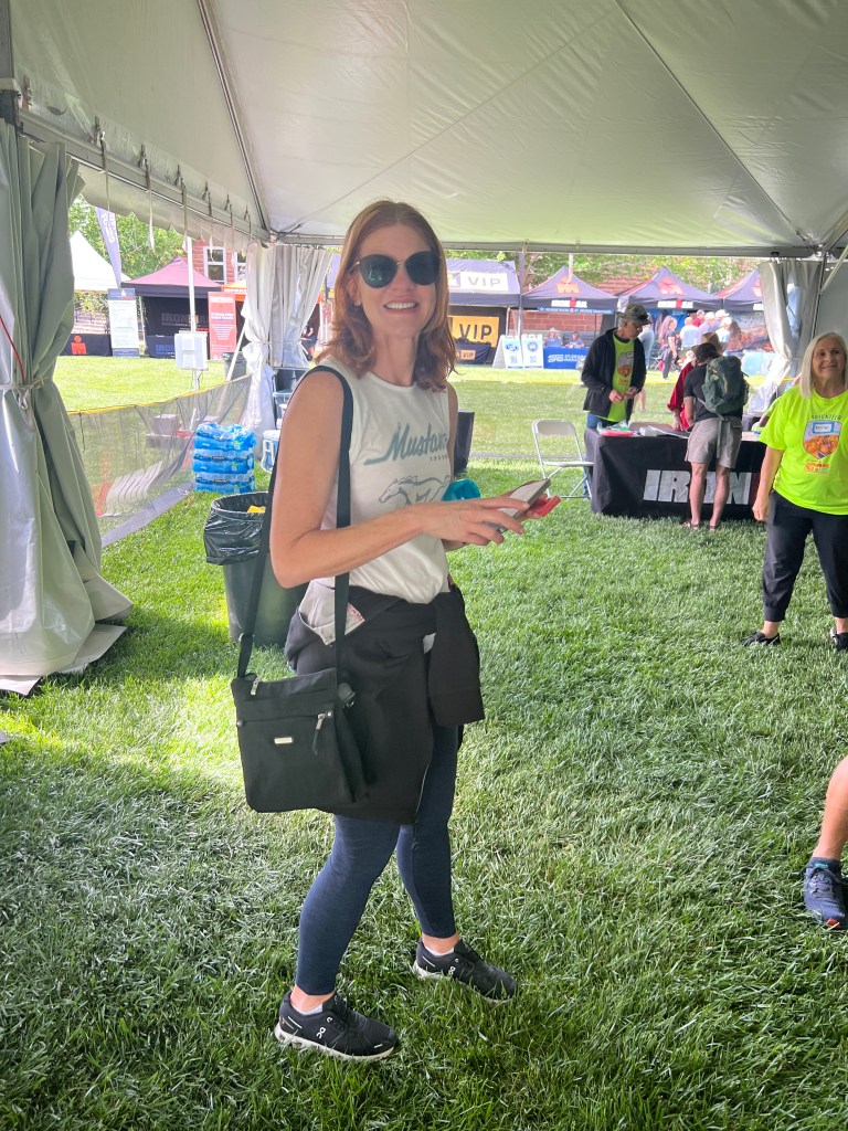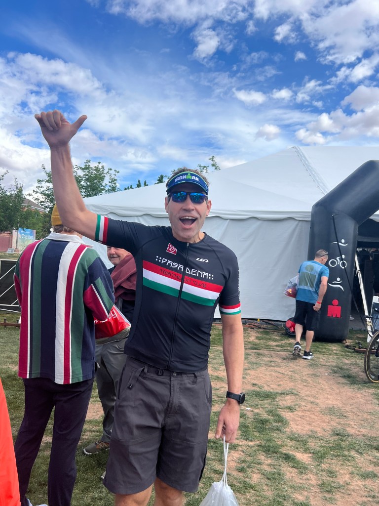 I put on a cycling jersey and all the rest of the gear. I don’t wear a tri-top. I saw lots of bikes from our club, since we racked together. I was pretty jazzed.