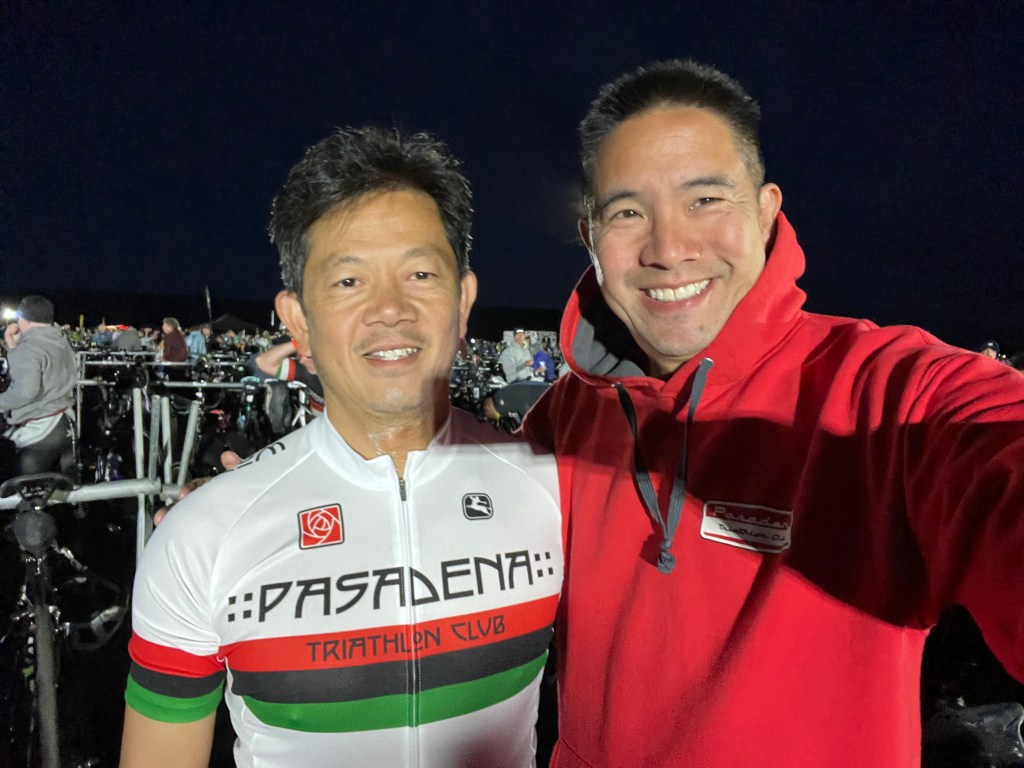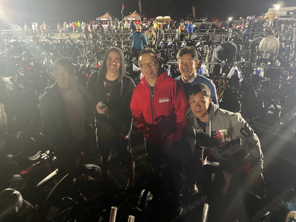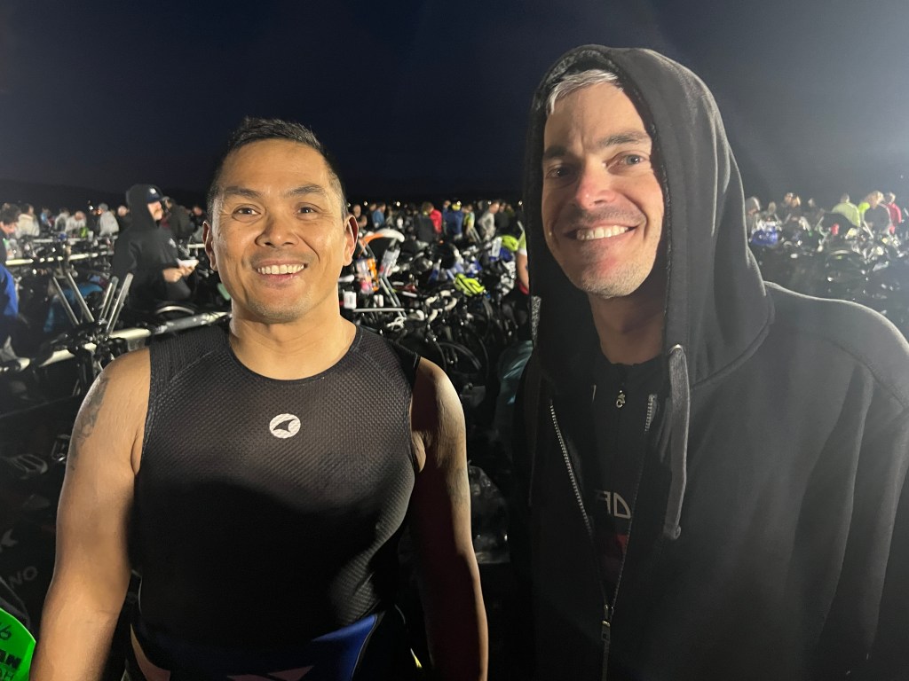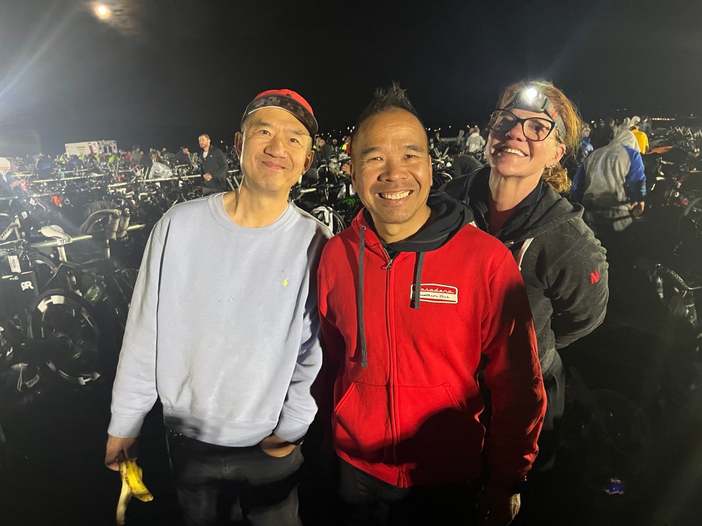 Didn’t sleep much too excited. Got up and packed. Morning Bag for pre-race clothes. It was cold in the morning. Lynda dropped out of the race due to injury. She was a trooper and got up early and drove me, James, and Greg to the T2 at the bus shuttle pick up, at about 4:45am. The bus driver was a dope. He got lost on the way there. Dead end at a construction zone. I got a little stressed out. Got to T1 at 5:30a. Set up with everybody. It was great to see everyone. Raoul split his pants open in his wetsuit! He had an eventful swim.