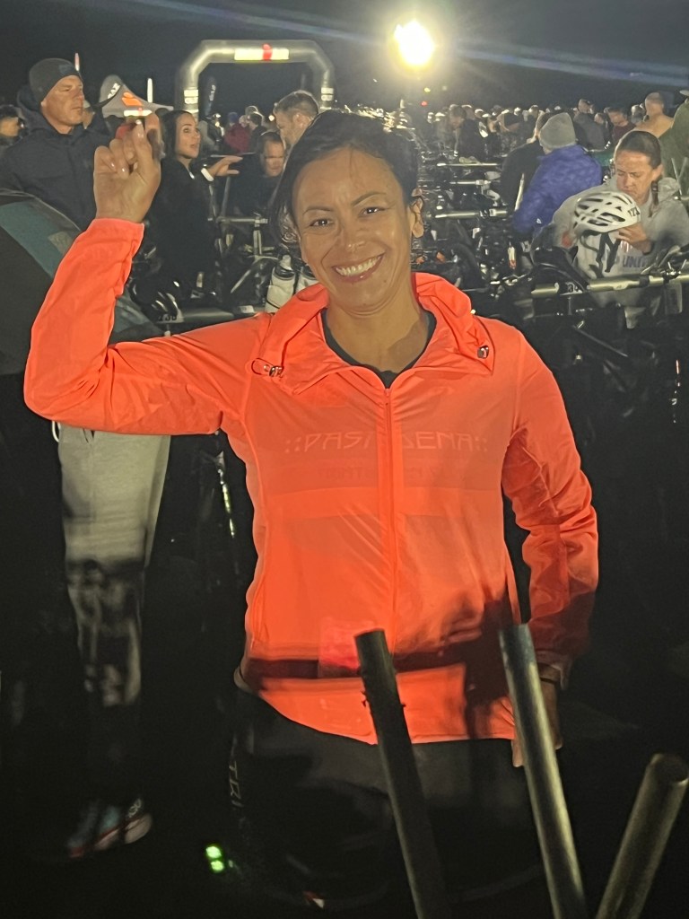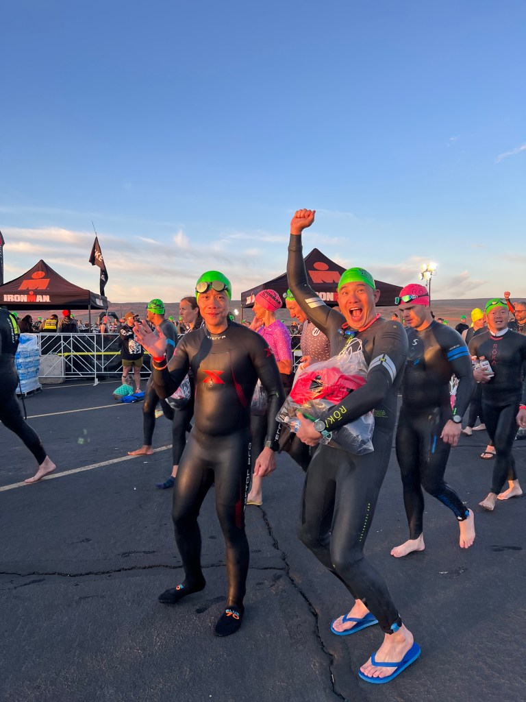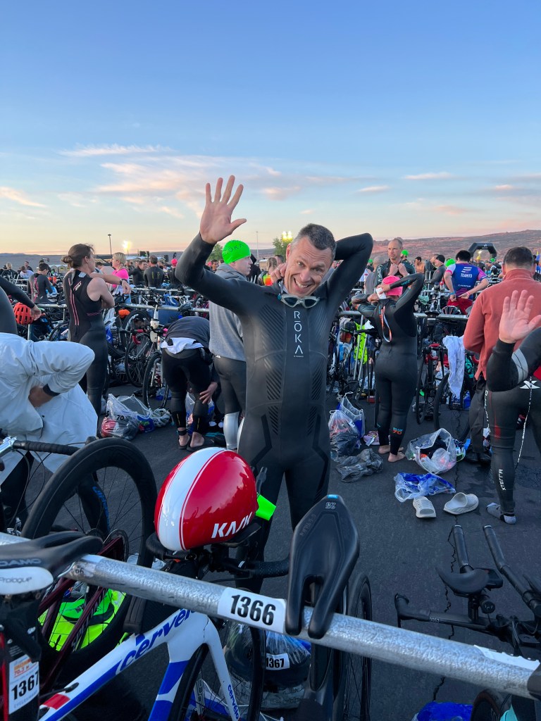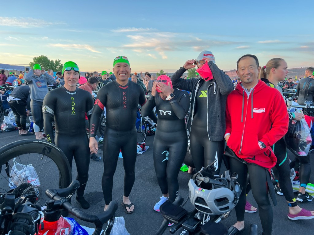 Didn’t sleep much too excited. Got up and packed. Morning Bag for pre-race clothes. It was cold in the morning. Lynda dropped out of the race due to injury. She was a trooper and got up early and drove me, James, and Greg to the T2 at the bus shuttle pick up, at about 4:45am. The bus driver was a dope. He got lost on the way there. Dead end at a construction zone. I got a little stressed out. Got to T1 at 5:30a. Set up with everybody. It was great to see everyone. Raoul split his pants open in his wetsuit! He had an eventful swim.