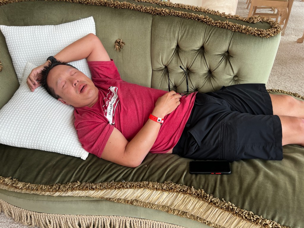 Briefly, my knees were tweaky and weren’t going to run much. But, we’re stable enough to speed walk. So, I buckled in and enjoyed the 2 loop course. I saw everyone on the run. It was great. Course is 2 loops. Mile 1-3 uphill along the foothill, 2%. Loops through golf course on cart roads, and some fairs. There was lots of trees releasing tons of floating seeds. It looked like it was snowing. Mile 4-7 back to town and around again. Rick, David caught me late in the run. James had an eventful run.