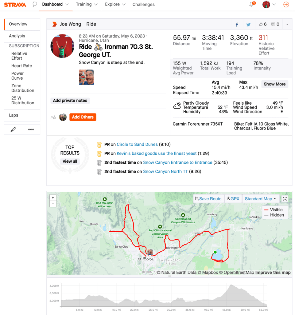 Felt pretty good on the bike. Super short potty stop at Aid #1. Confirmed that it would be a good day. Lots of climbing on the bike. 20 miles from Sand Hollow to St. George. Big long climbs. Julian, Paul, Alvin caught me in the first half. Steeper climbs through suburbs. I hit top speed of 42mph at Mile 22 in the ‘burbs. Short stop at Aid #3, refueled. Bananas. Then ride through town. 20 miles west of town. Some descents through town. Vicky and Mike caught me on the second half. I hit 41 mph at Mile 34. Snow Canyon was Mile 41 to 46. Starts out 3-5%, middle is 7-8%, top is 10-12%. I was super happy I didn’t have to stop or walk. There were lots of walkers at the top. I was creeping along very slowly at the 12% top section. One guy was to my right in the shoulder, he was going so slow, that he tipped over and fell off the side of the road and rolled down the rocks. I didn’t stop. Sorry dude. At Mile 46, right turn out of Snow Canyon. Downhill back to town. I hit high 30s mph. Great Ride.