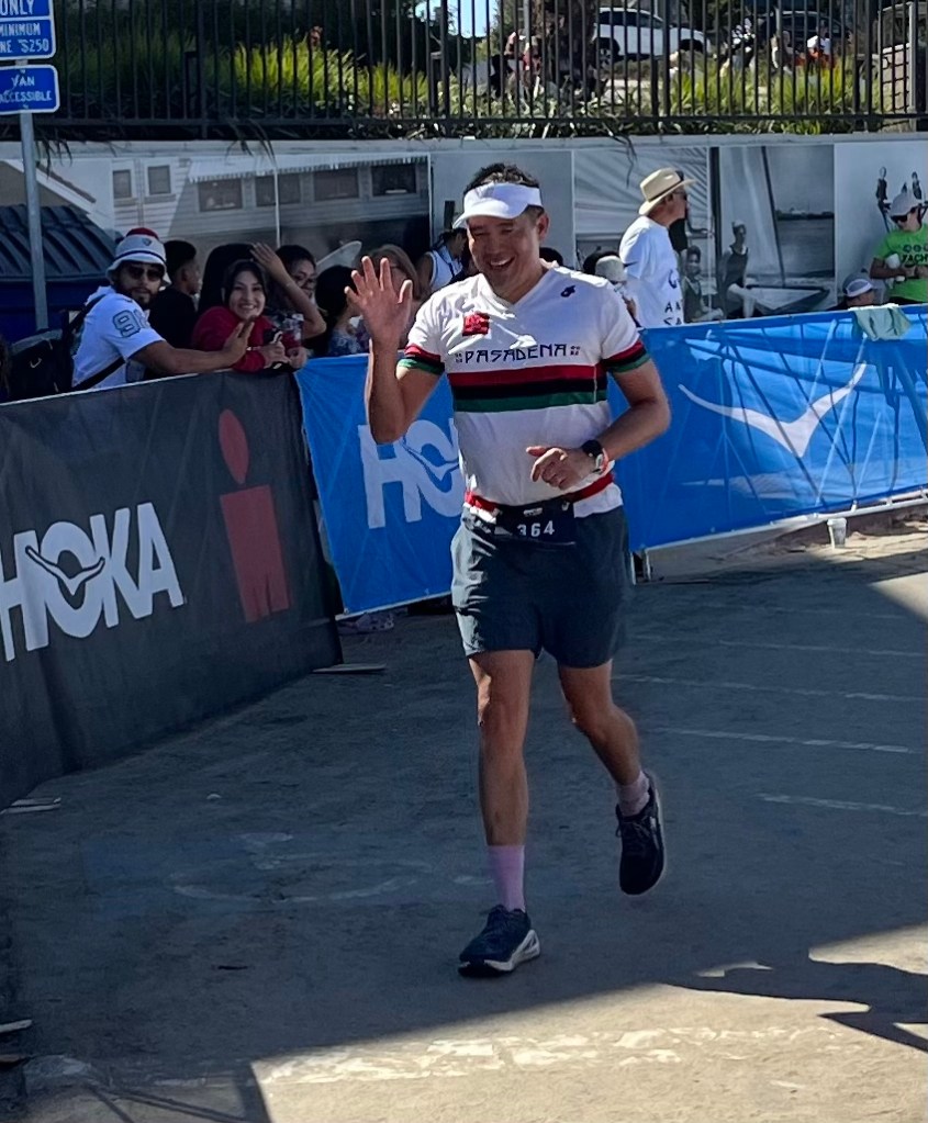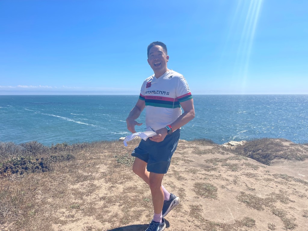 Mile 1: Run along the coast line. Really nice. I saw Alvin at Mile 1 aid station. I forgot my supplement pack at T2. Bummer. I saw Sue a bit later. She shared some electrolyte pills. Life Saver. Vicky passed my at mile 2. Richard passed me at mile 3. He took a picture. I was run / walk for the first few miles. My heart rate was outta control. I was hitting 150+bpm, unusual. I walked more to keep the heart rate in check.
