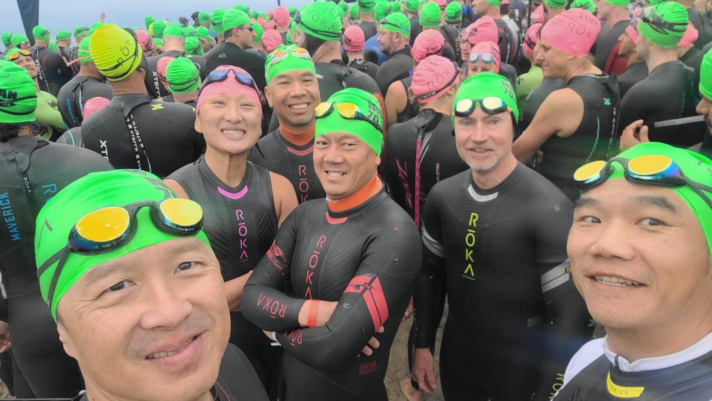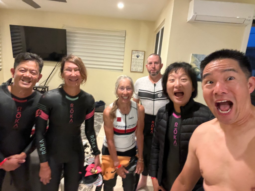 VBRO was so close to the transition, we went down to transition at 5:30a to set up, then we went back to the house for potty break. This worked out perfectly. We walked down to the water at 6:30a. Sue and I splashed around to acclimate to the water. It was cold for sure. But, getting in early helped my to start swim for later. Not a shock to the heart and lungs.