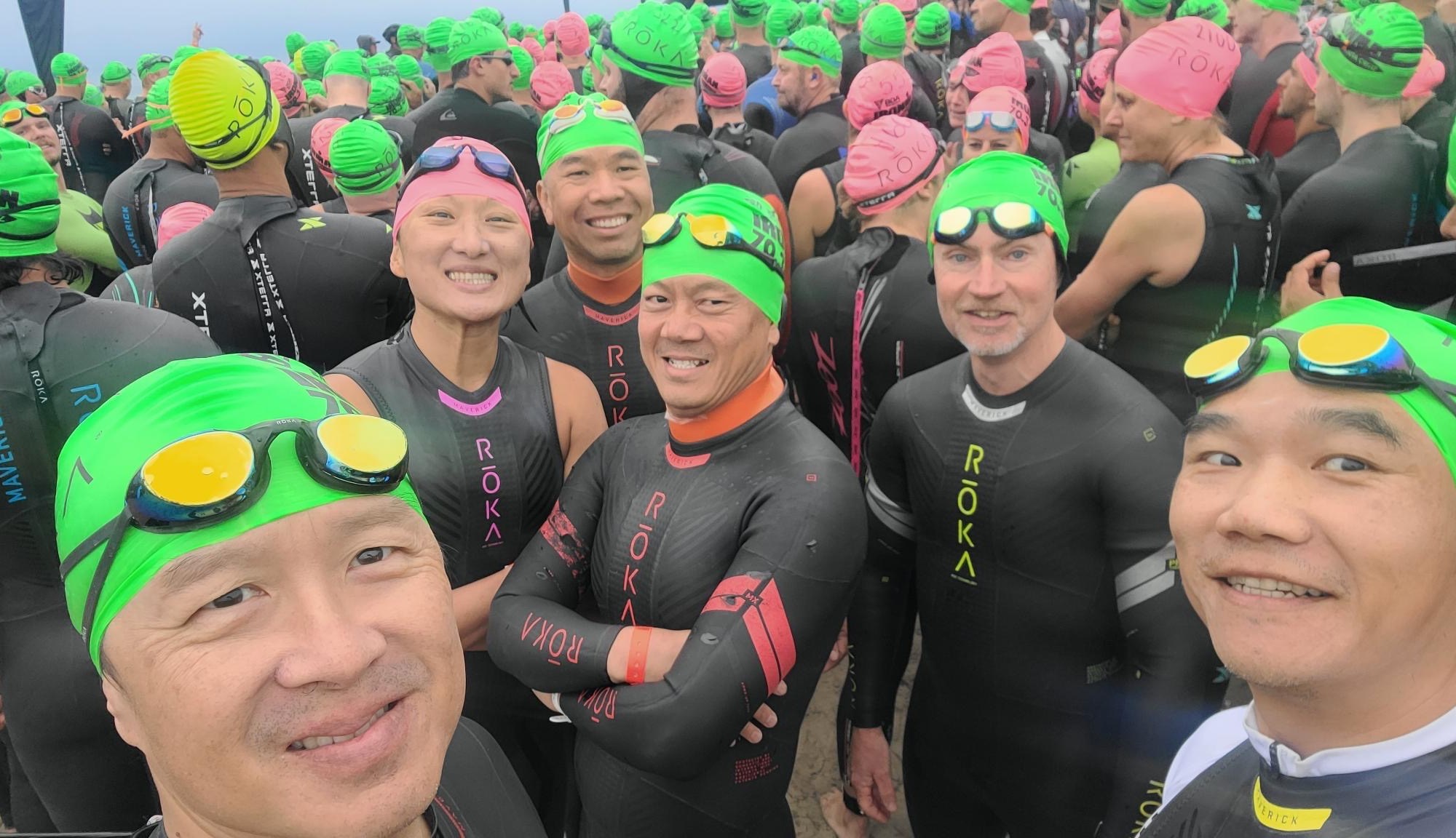 VBRO was so close to the transition, we went down to transition at 5:30a to set up, then we went back to the house for potty break. This worked out perfectly. We walked down to the water at 6:30a. Sue and I splashed around to acclimate to the water. It was cold for sure. But, getting in early helped my to start swim for later. Not a shock to the heart and lungs.