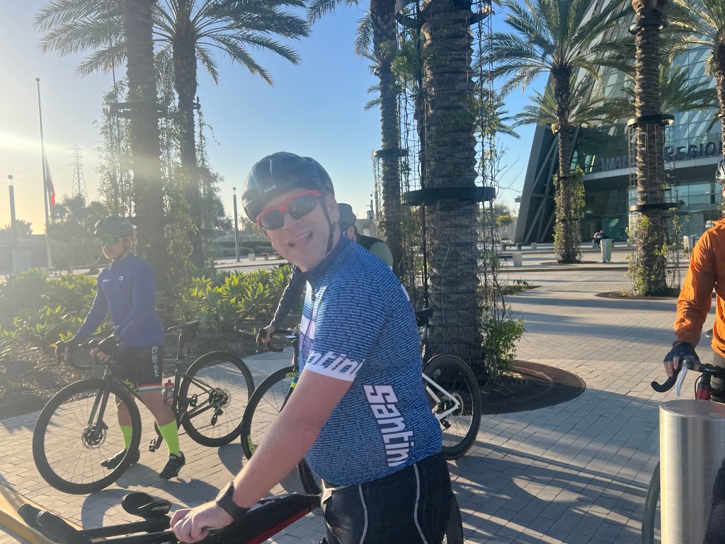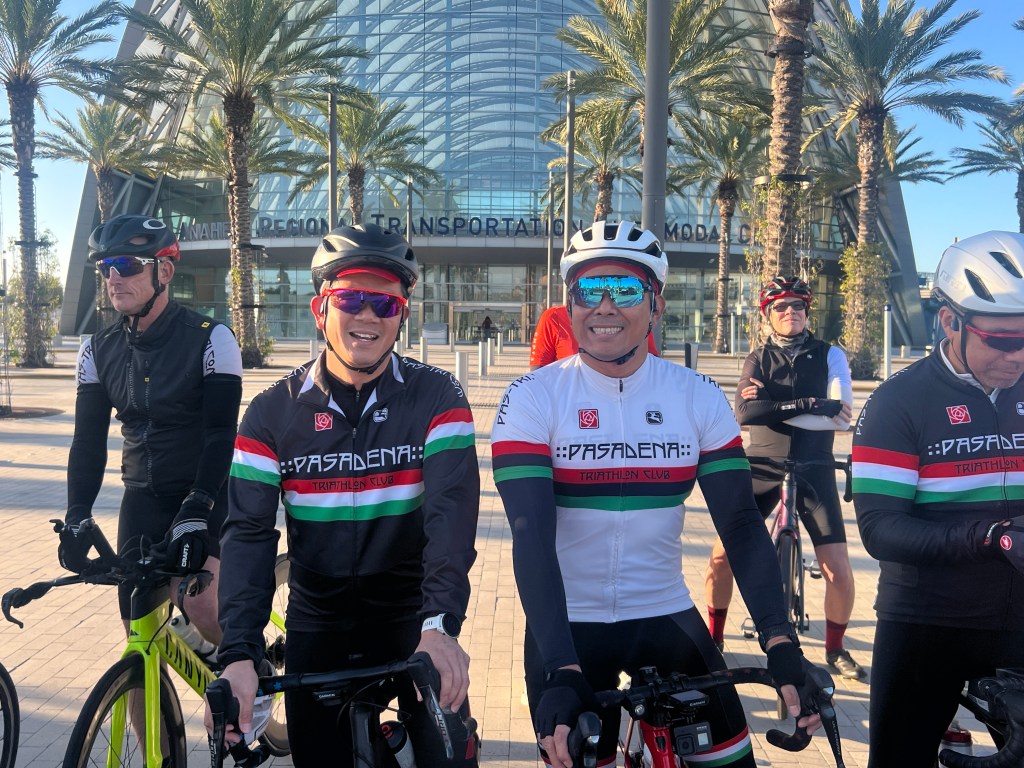 Mile 0: We met up at the Anaheim Multi-Modal. Amtrak station. Lucas was our SAG driver. He drove the Sprinter Van with the PTC trailer. We dropped off our day bag with a change of clothes into the trailer. We could drop off more stuff later, then change our clothes at the end. Great logistics. We took a group picture and hopped on the Anaheim River Trail. We Rode by the Anaheim Angels Stadium.