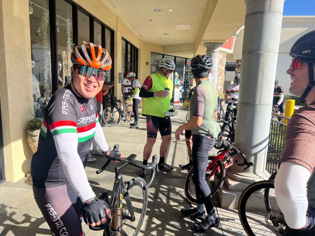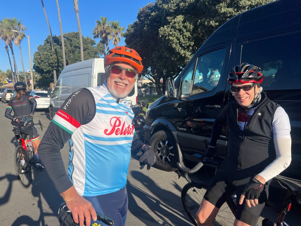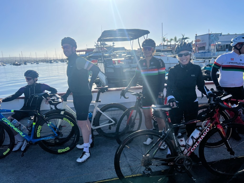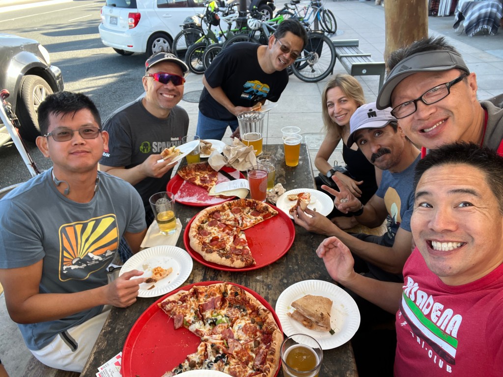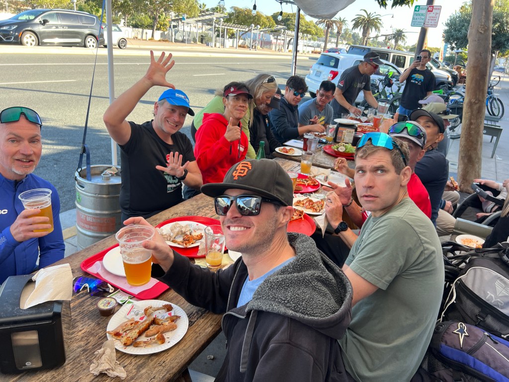 Mile 80: Pizza Port. Loaded bike into Trailer. Thanks, Lucas! Changed clothes. Pizza, Beer, Friends. We saw Johnna and Barry. Some old PTC’ers, with daughter and baby! Kevin connected with friend from SD, who shared frightening shark pics from cage adventures. Chartered bus picked us up at 3:30p. Drove back to Anaheim. Whew! Big beautiful day. Epic ride with the Club. Thanks to Lynda and Lucas for doing a lot of the leg work to make this happen. $65/person to cover the SAG and Bus, and trailer.